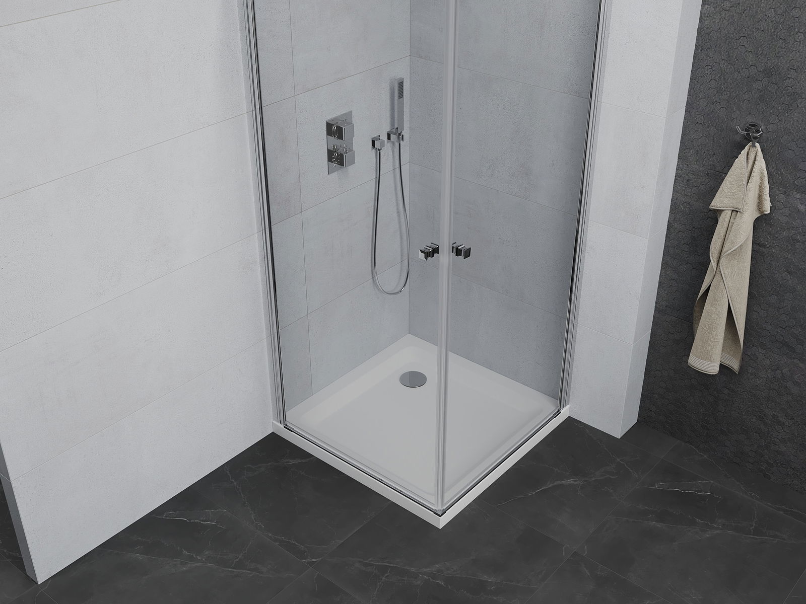 L'impugnatura pratica e comoda è realizzata in metallo durevole e resistente. La forma alla moda combinata con una finitura abbinata al colore dei profili conferisce all'insieme un aspetto moderno e elegante, enfatizzando l'estetica di ogni bagno.