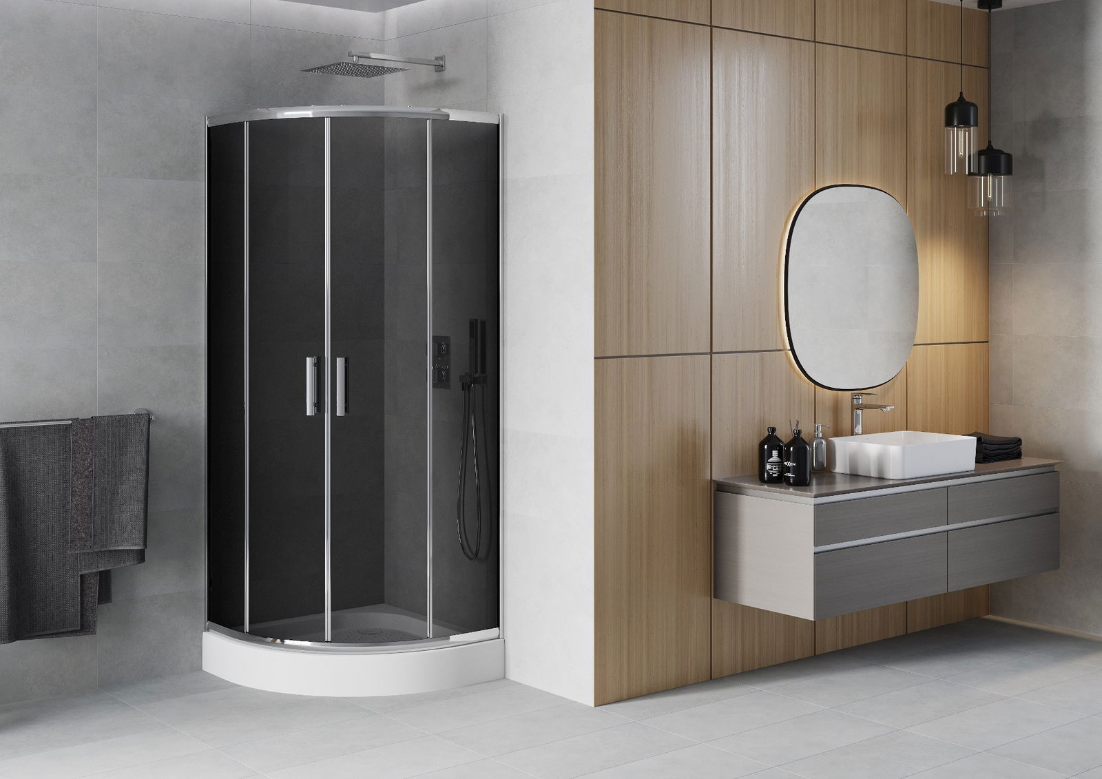 L'impugnatura pratica e comoda è realizzata in metallo durevole e resistente. La forma alla moda combinata con una finitura abbinata al colore dei profili conferisce all'insieme un aspetto moderno e elegante, enfatizzando l'estetica di ogni bagno.