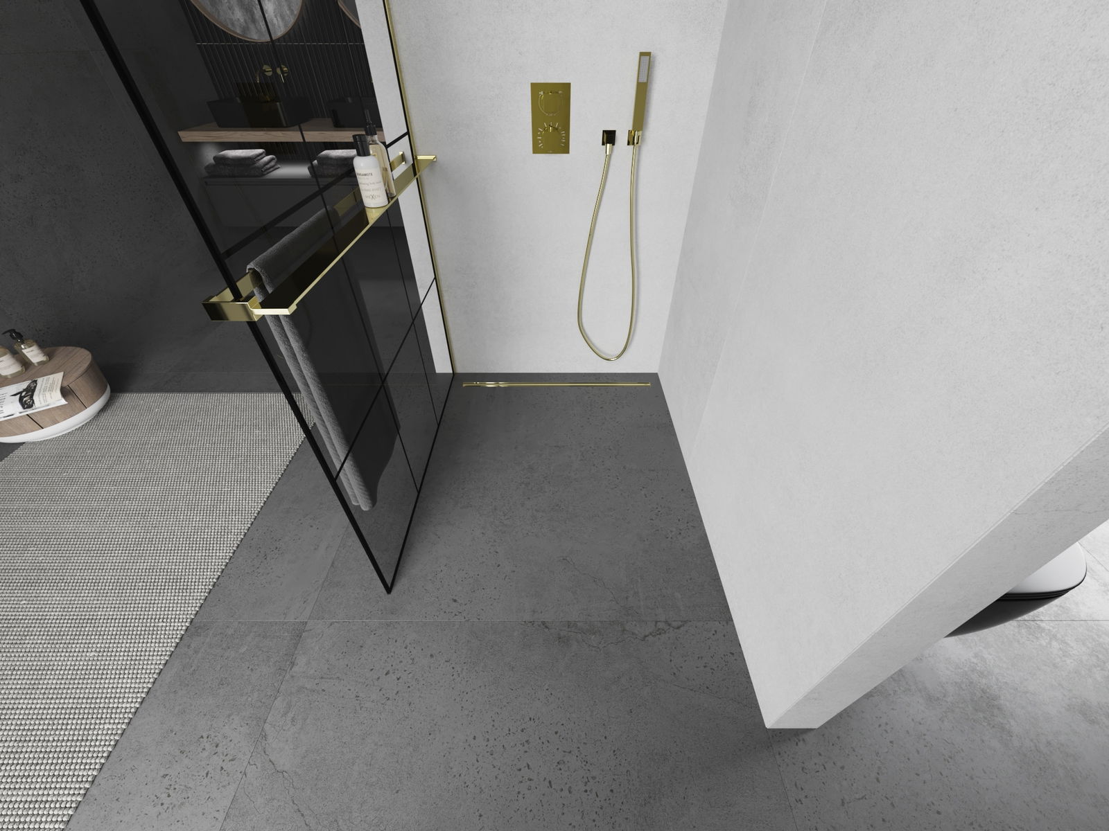Mexen Kioto+ parete doccia con mensola Walk-in 100 x 200 cm, griglia nera, oro - 800-100-121-50-77