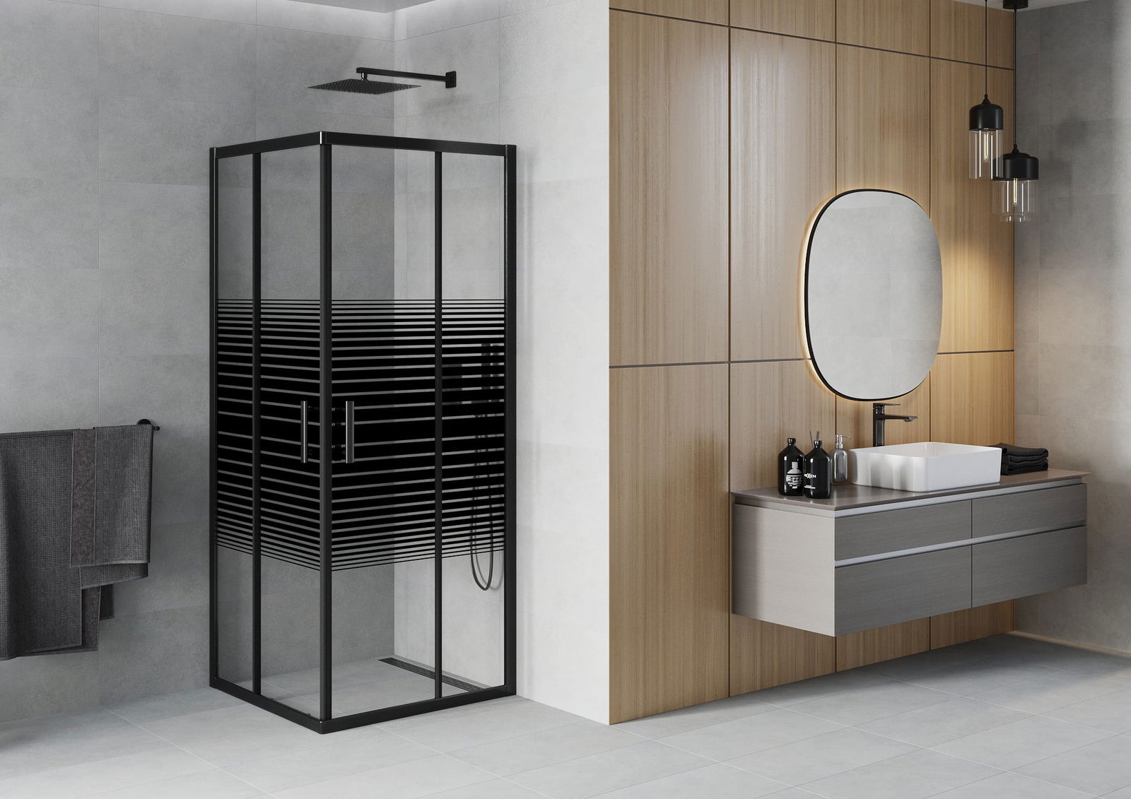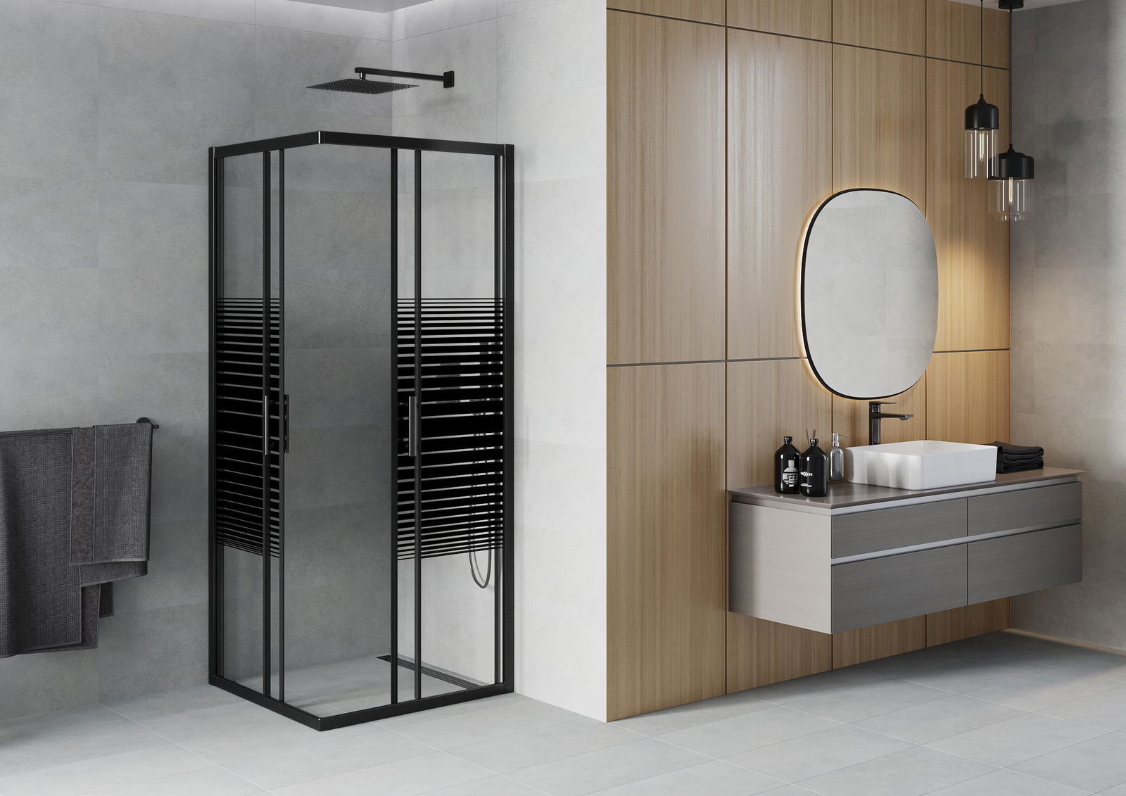 L'impugnatura pratica e comoda è realizzata in metallo durevole e resistente. La forma alla moda combinata con una finitura abbinata al colore dei profili conferisce all'insieme un aspetto moderno e elegante, enfatizzando l'estetica di ogni bagno.