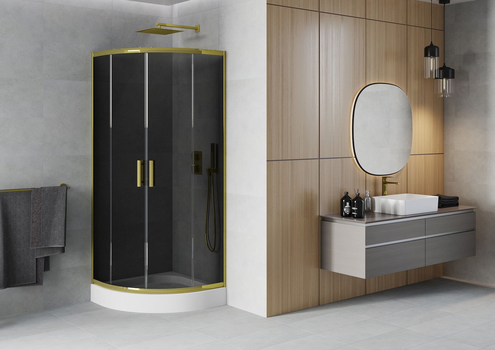 Mexen Rio cabina doccia semicircolare 90 x 90 cm, grafite, oro + piatto doccia Rio, bianco - 863-090-090-50-0-4710