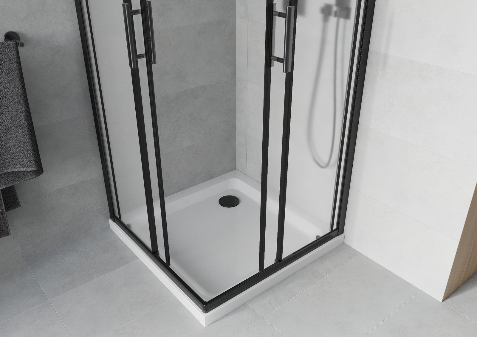 L'impugnatura pratica e comoda è realizzata in metallo durevole e resistente. La forma alla moda combinata con una finitura abbinata al colore dei profili conferisce all'insieme un aspetto moderno e elegante, enfatizzando l'estetica di ogni bagno.