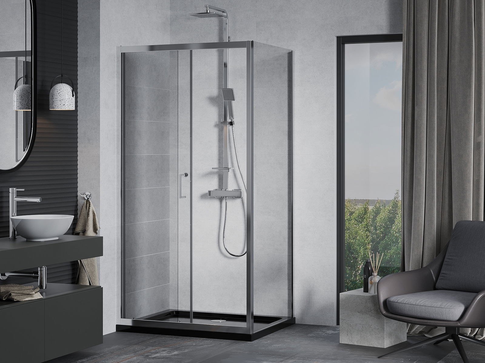 L'impugnatura pratica e comoda è realizzata in metallo durevole e resistente. La forma alla moda combinata con una finitura abbinata al colore dei profili conferisce all'insieme un aspetto moderno e elegante, enfatizzando l'estetica di ogni bagno.