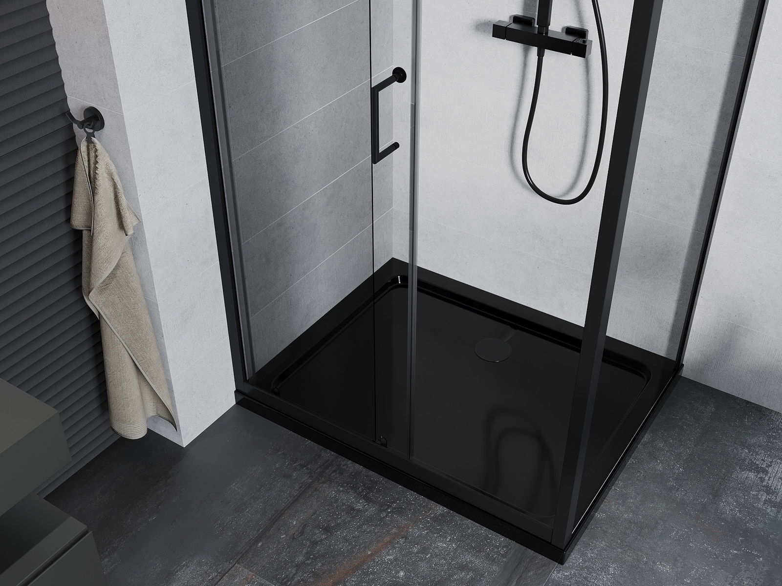 L'impugnatura pratica e comoda è realizzata in metallo durevole e resistente. La forma alla moda combinata con una finitura abbinata al colore dei profili conferisce all'insieme un aspetto moderno e elegante, enfatizzando l'estetica di ogni bagno.