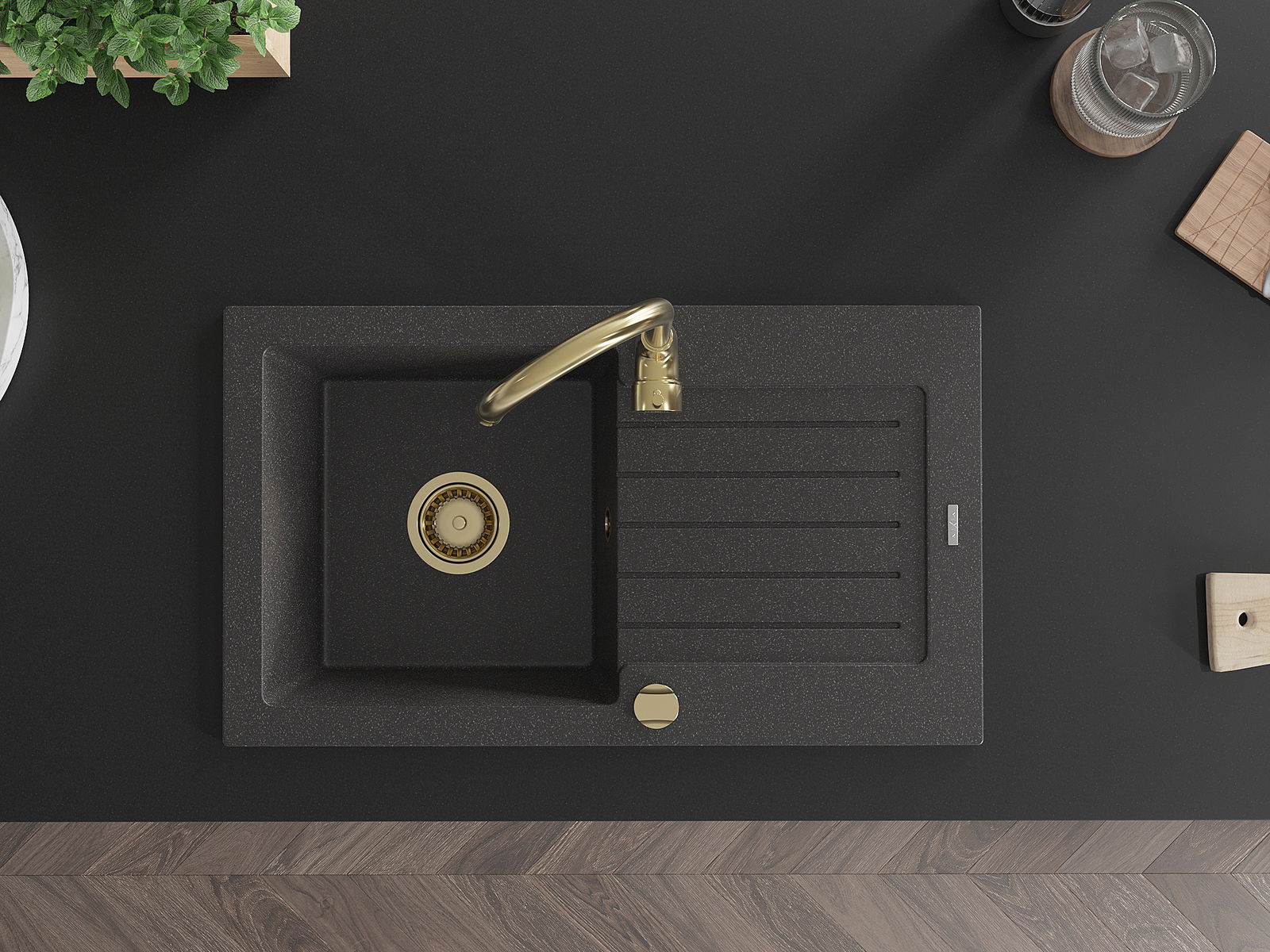Mexen Pablo lavello in granito 1-vasca con scolapiatti 752 x 436 mm, nero maculato, sifone dorato - 6510751010-76-G