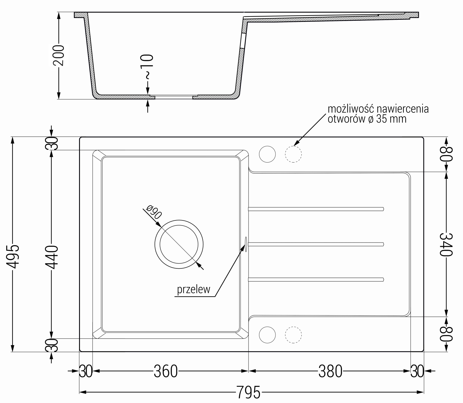 Il lavello dispone di 2 fori pre-trapanati di diametro 35 mm, da perforare autonomamente. Possono essere utilizzati, tra l'altro, per montare un dosatore di liquidi, che eliminerà la presenza di bottiglie di plastica in cucina e darà un tocco di eleganza alla finitura.