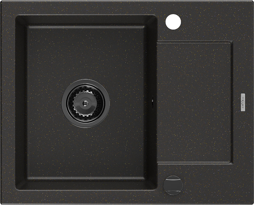 Mexen Enzo lavello in granito 1-vasca con sgocciolatoio 576 x 465 mm, nero/oro metallico, sifone nero - 6506571005-75-B