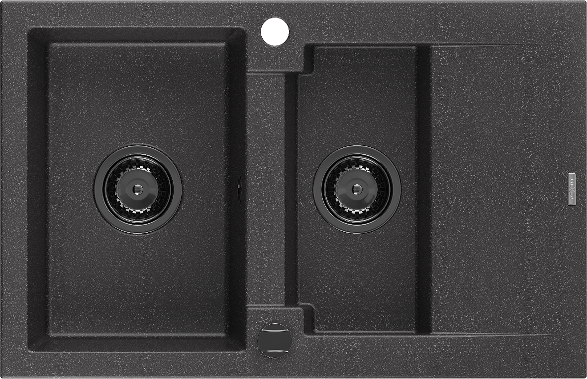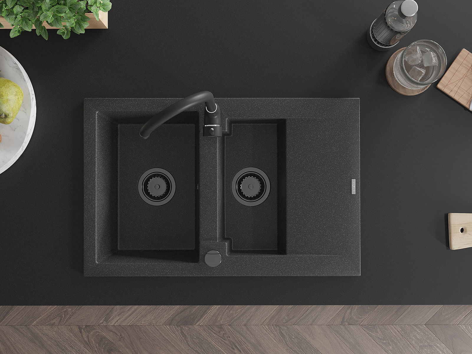 Mexen Gaspar lavello in granito 1,5 vasche con sgocciolatoio 737 x 475 mm, nero punteggiato, sifone nero - 6507731505-76-B