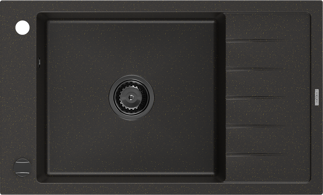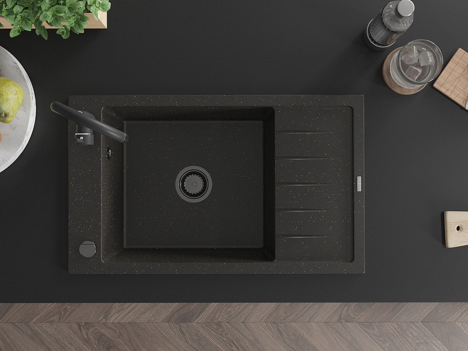 Mexen Elias lavello in granito a una vasca con sgocciolatoio 795 x 480 mm, nero/oro metallizzato, sifone nero - 6511791005-75-B