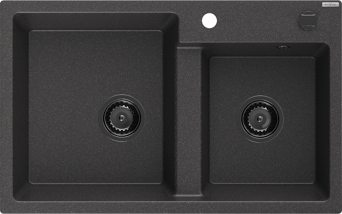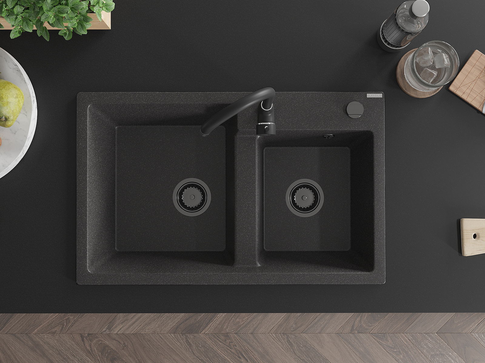 Mexen Tomas lavello in granito a 2 vasche 800 x 500 mm, nero maculato, sifone nero - 6516802000-76-B
