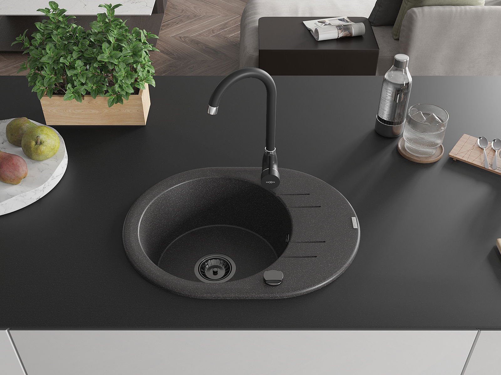Mexen Kevin lavello in granito a 1 vasca con scolapiatti 586 x 458 mm, nero maculato, sifone nero - 6517581005-76-B