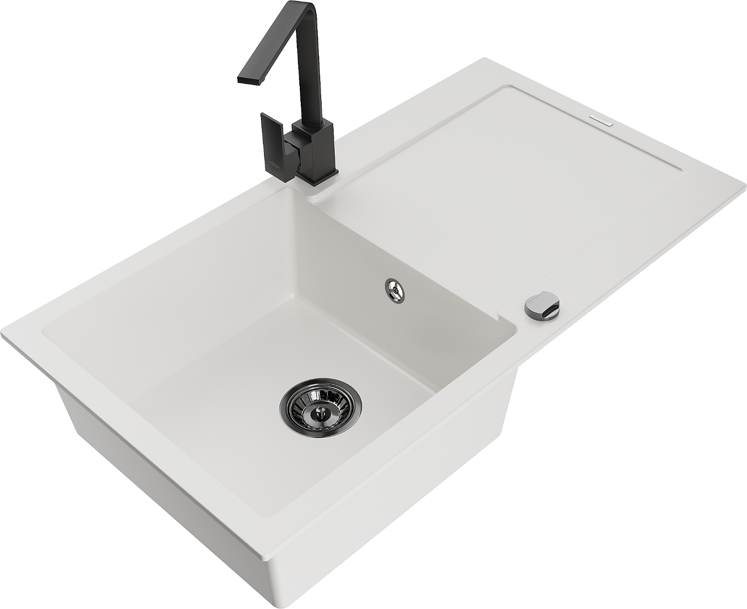 Mexen Leo lavello da cucina in granito a 1 vasca con sgocciolatoio e miscelatore da cucina Rita, bianco - 6501-20-670300-70