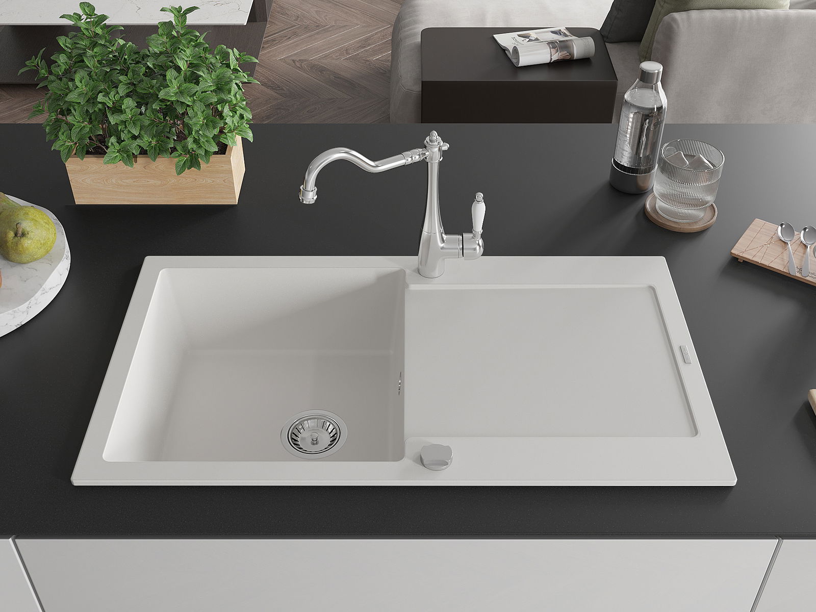 Mexen Leo lavello in granito 1-vasca con scolapiatti e rubinetto cucina Carla, bianco - 6501-20-670700-00