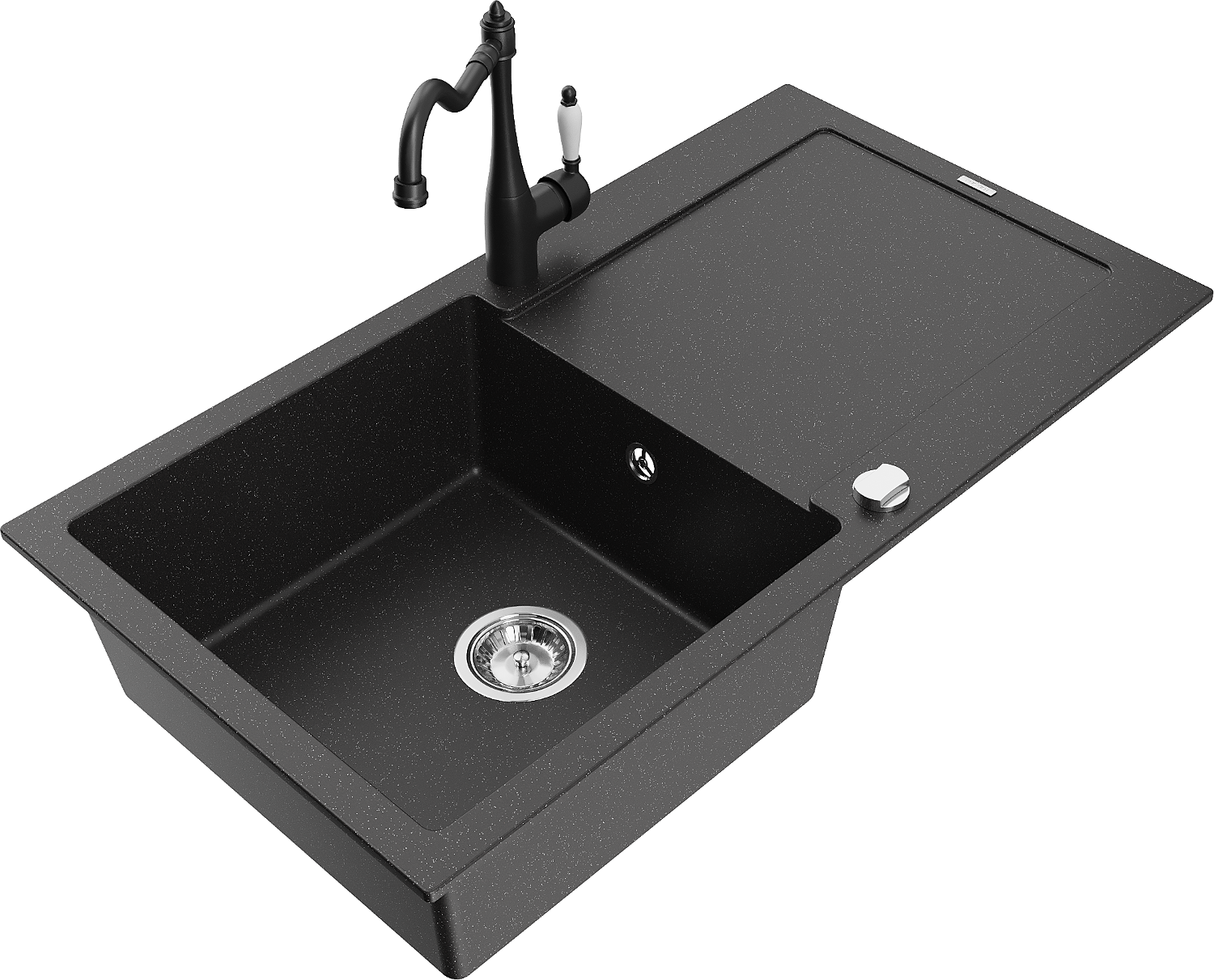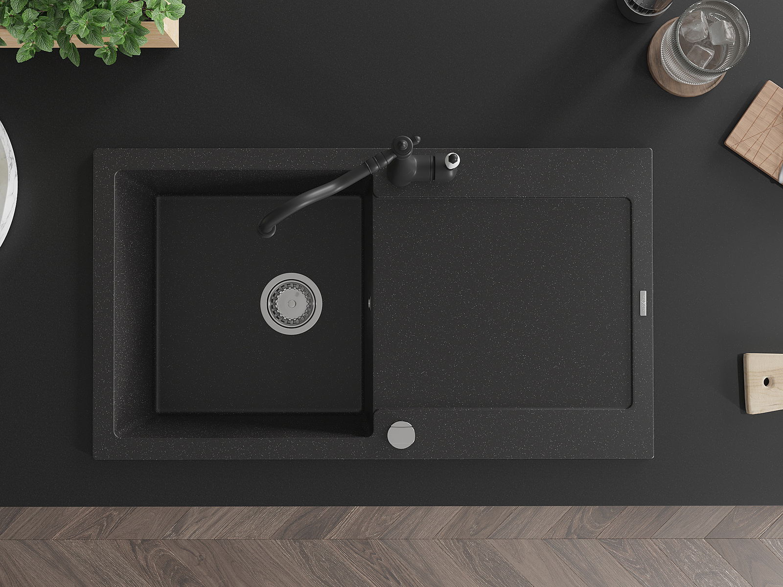 Mexen Leo lavello in granito a 1 vasca con gocciolatoio e rubinetto da cucina Carla, nero/metallo argentato - 6501-73-670700-70
