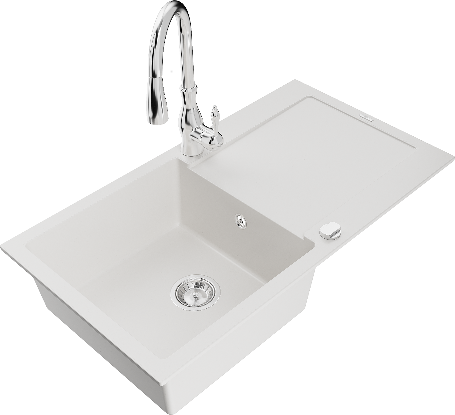 Mexen Leo lavello da cucina in granito 1 vasca con scolapiatti e rubinetto da cucina Savita, bianco - 6501-20-672601-00