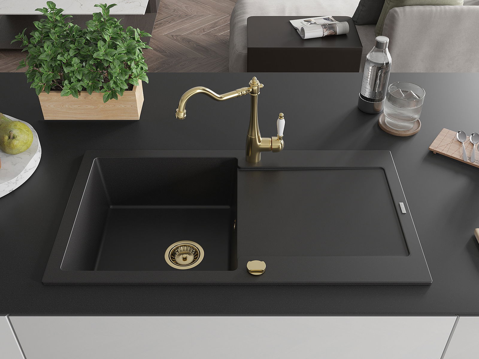Mexen Leo lavello da cucina in granito a 1 vasca con scolapiatti e rubinetto da cucina Carla, nero - 6501-77-670700-50