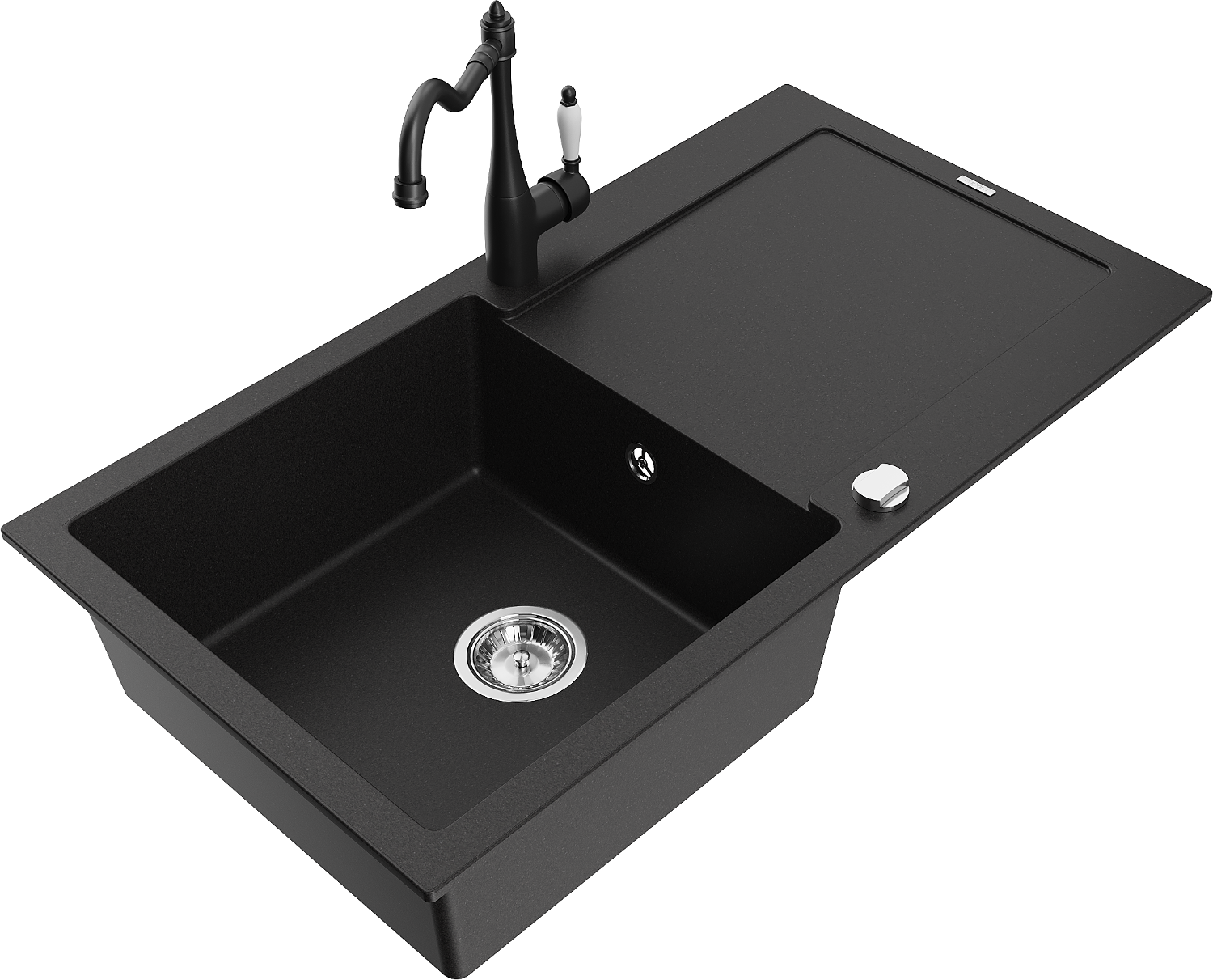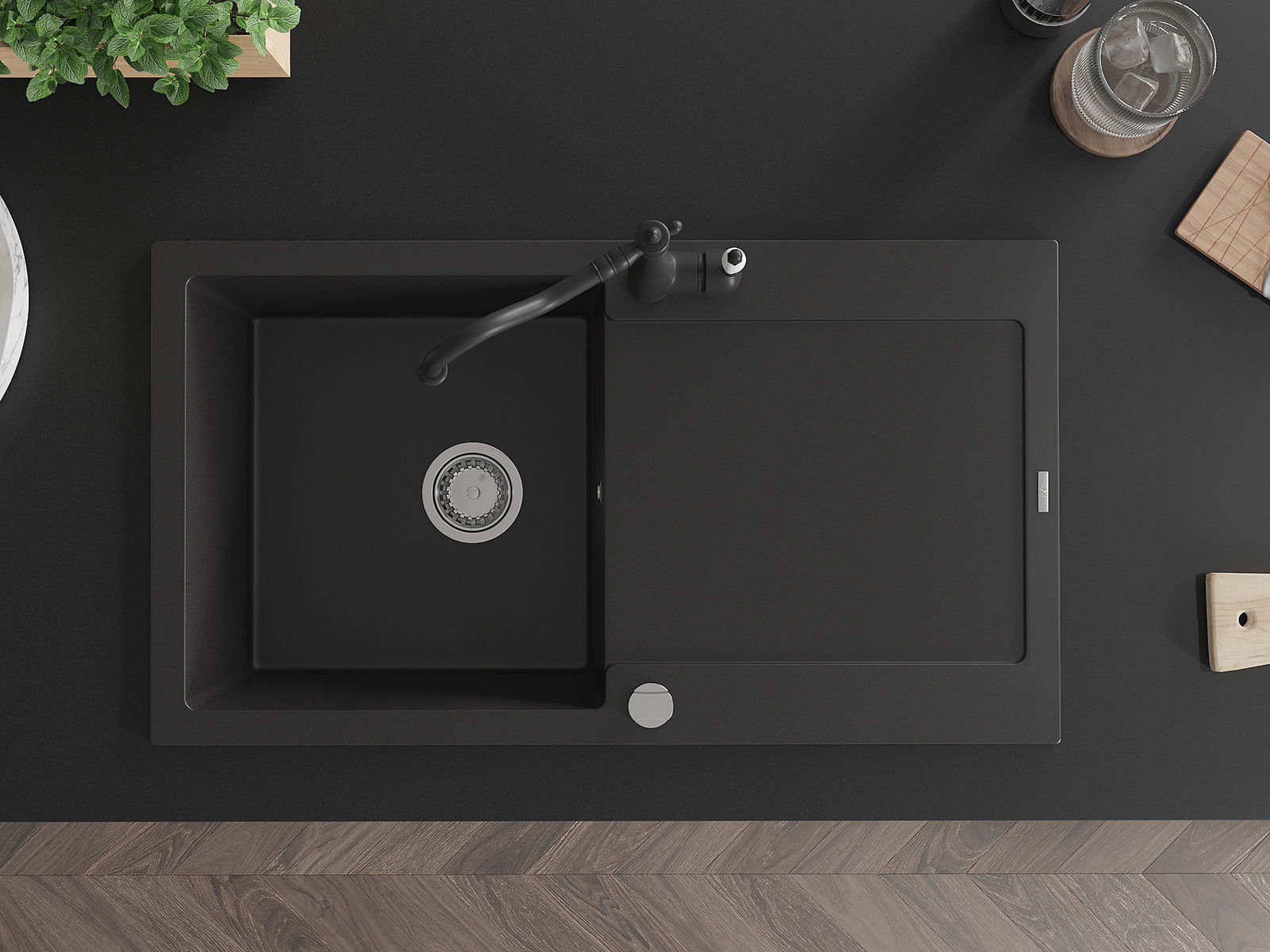 Mexen Leo lavello in granito con una vasca, scolapiatti e rubinetto da cucina Carla, nero - 6501-77-670700-70