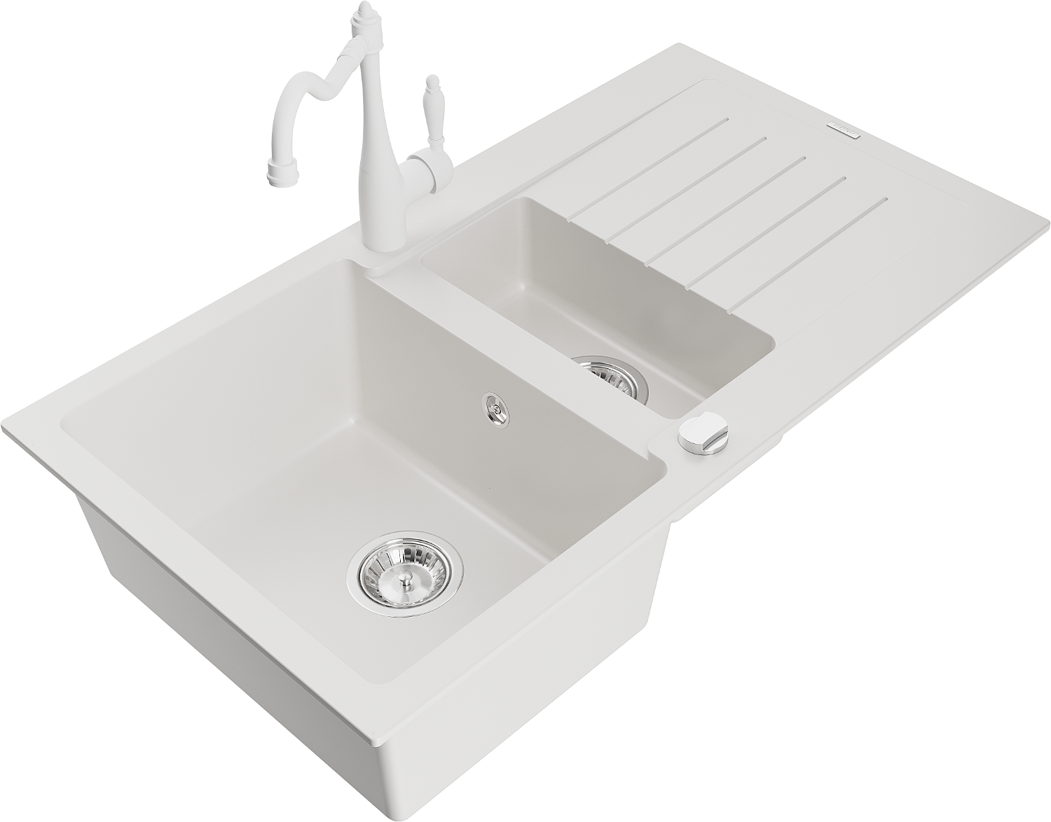 Mexen Matias lavello in granito 1,5 vasche con scolapiatti e rubinetto cucina Carla, bianco - 6502-20-670700-20
