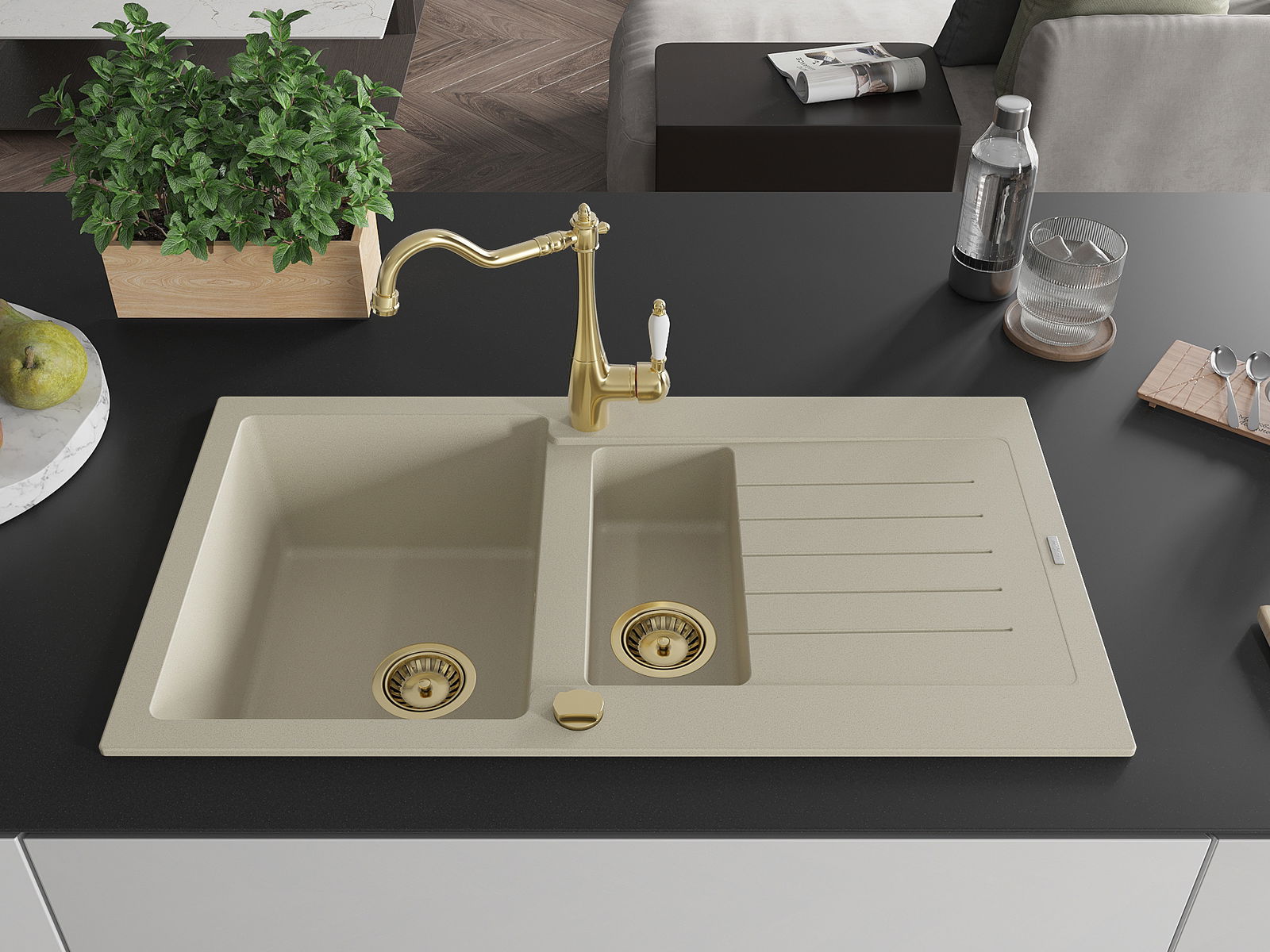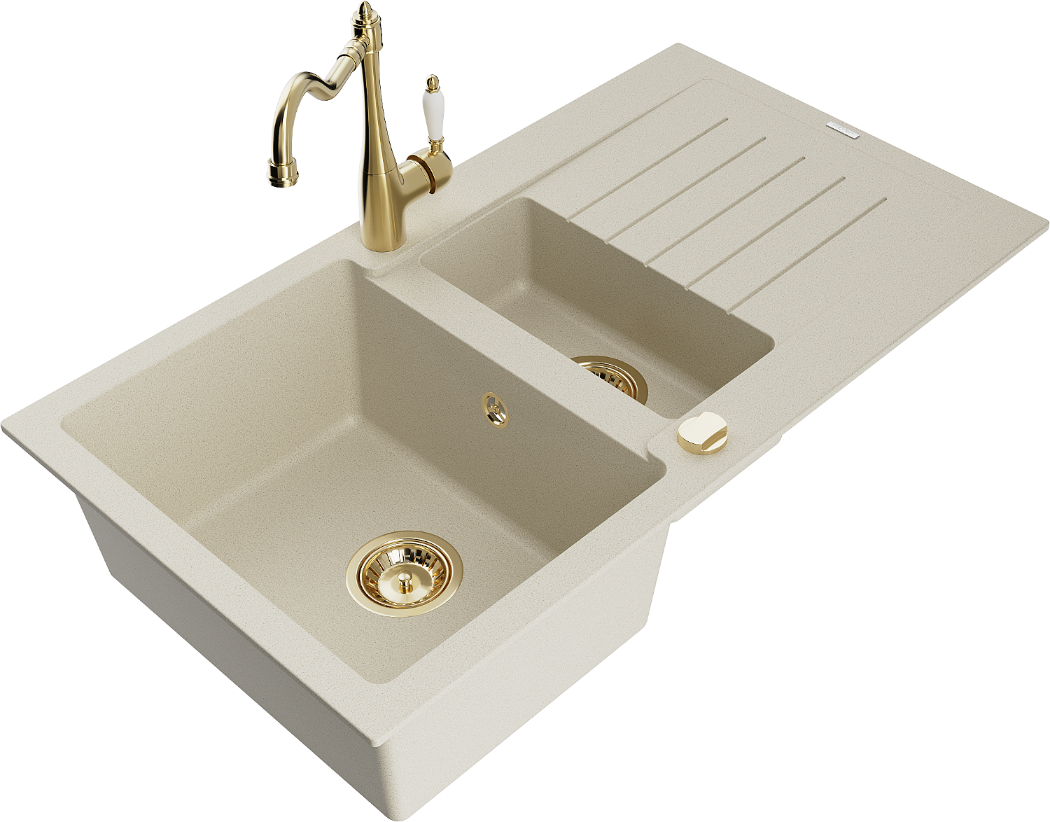 Mexen Matias lavello in granito 1,5 vasche con scolapiatti e miscelatore cucina Carla, beige - 6502-69-670700-50