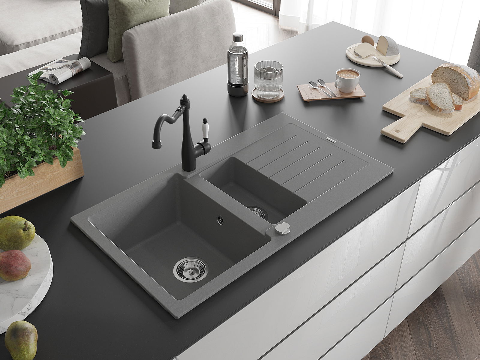 La scelta di un lavello con sgocciolatoio è una soluzione pratica che consente di riporre piatti, verdure e frutta lavati. Lo sgocciolatoio facilita la cucina quotidiana e aiuta a mantenere l'ordine in cucina.