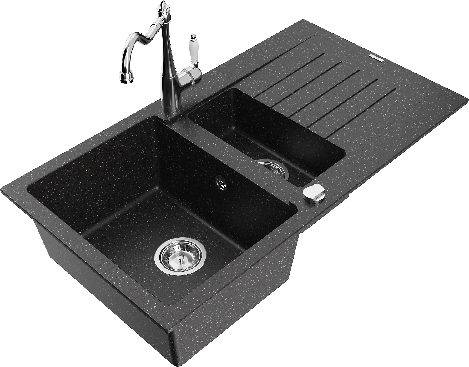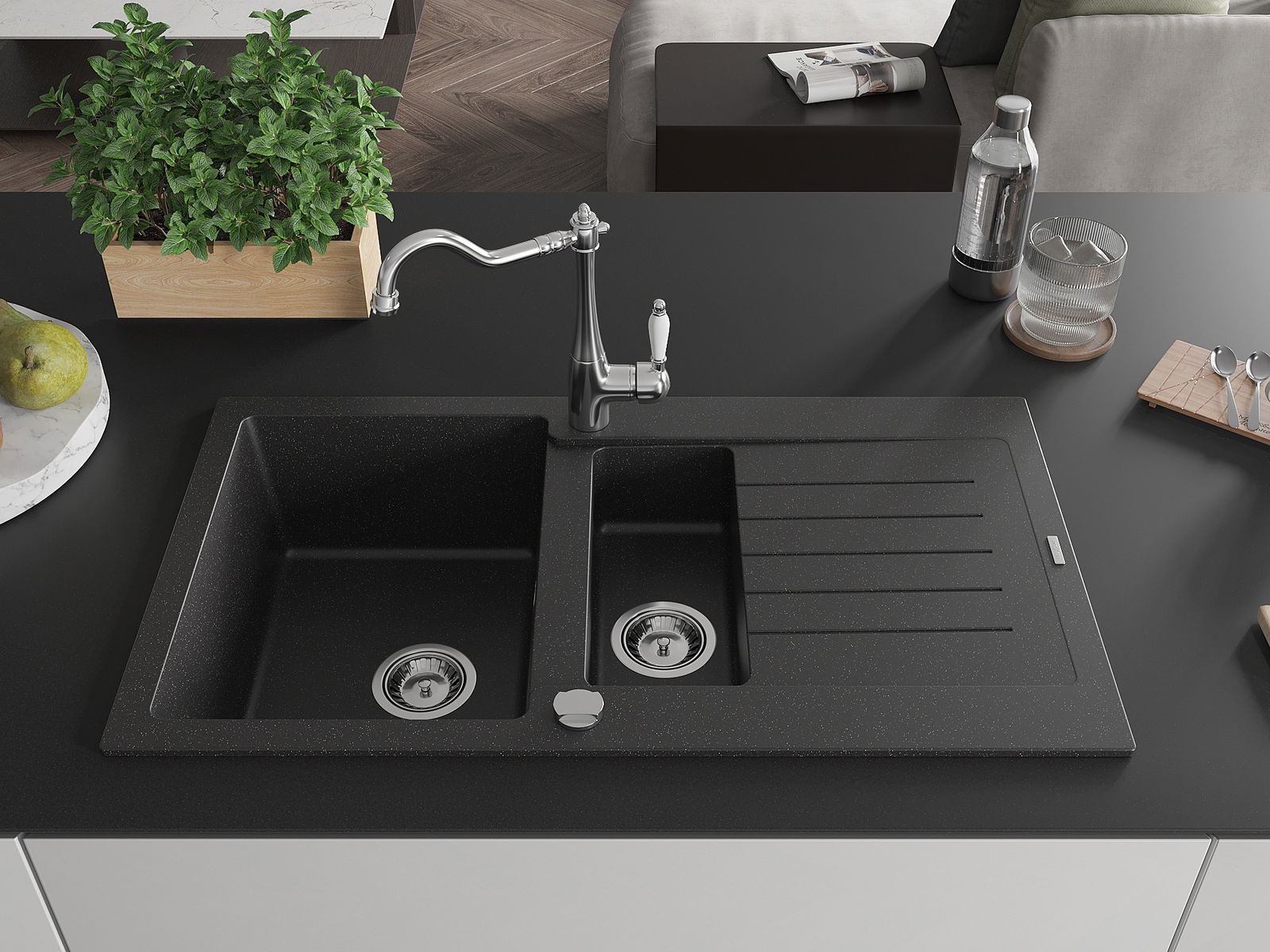 Mexen Matias lavello in granito da 1,5 vasche con scolapiatti e rubinetto da cucina Carla nero/metallo argento