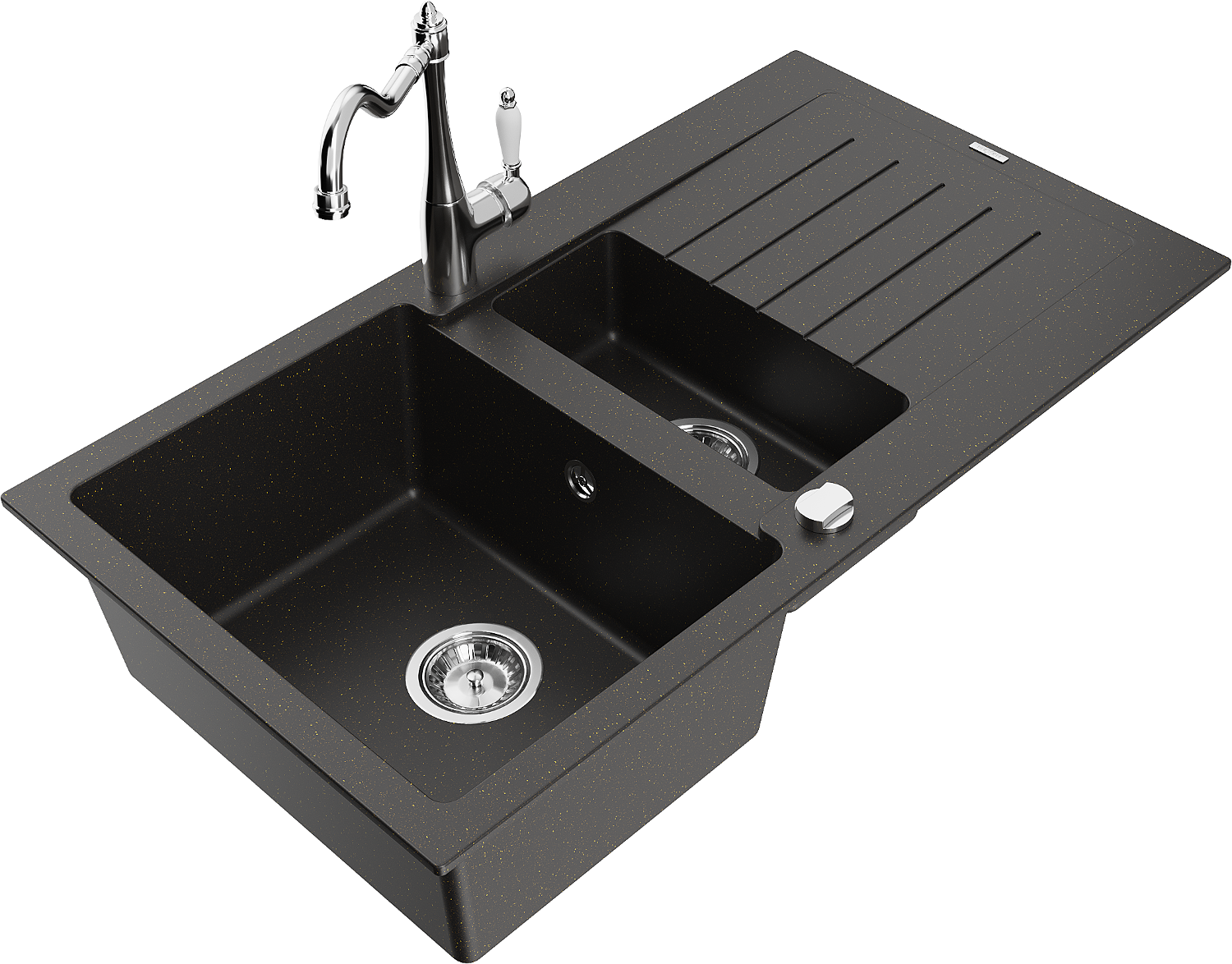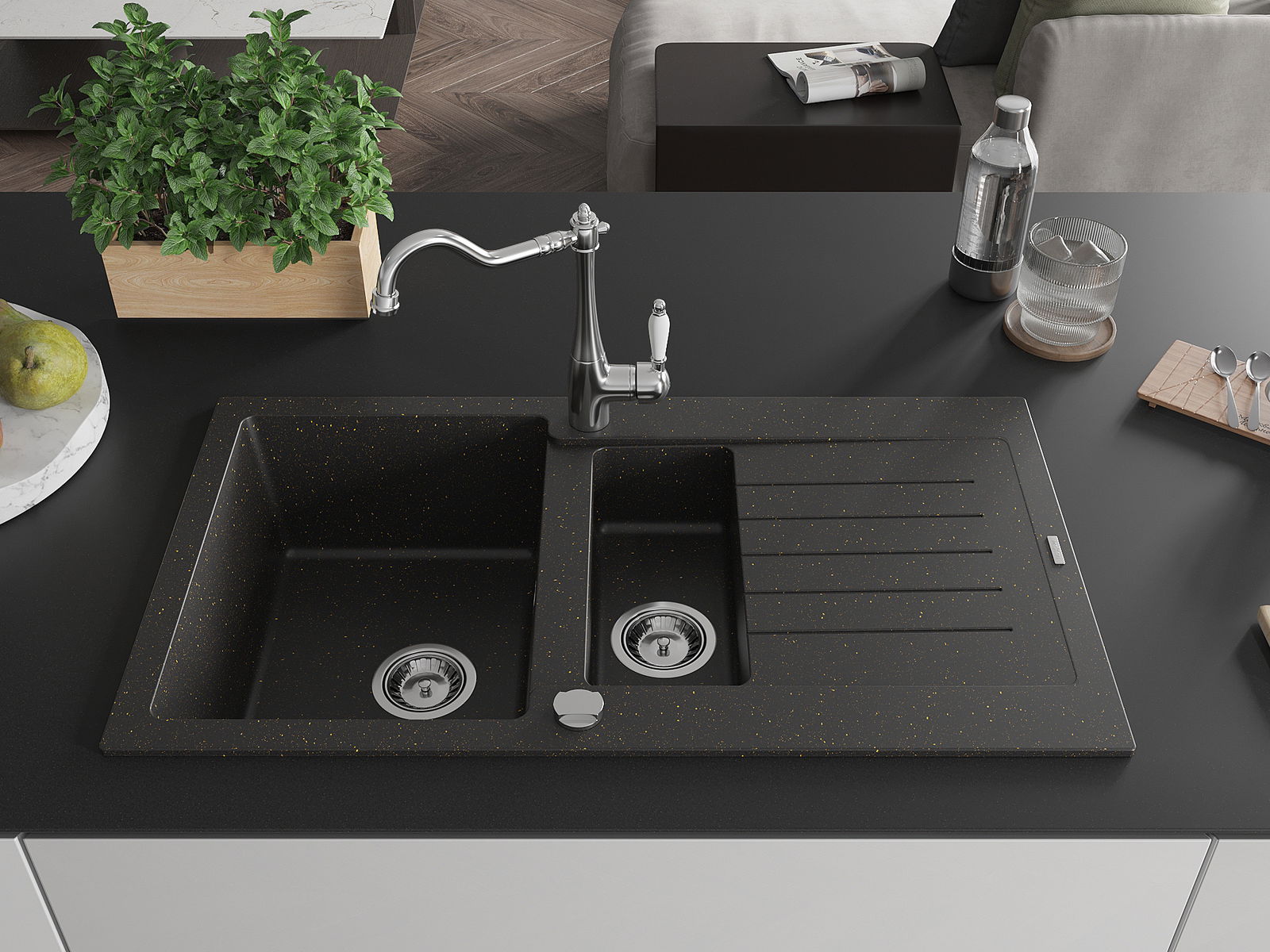 Mexen Matias lavello in granito a 1,5 vasche con scolapiatti e rubinetto da cucina Carla, nero/oro metallizzato