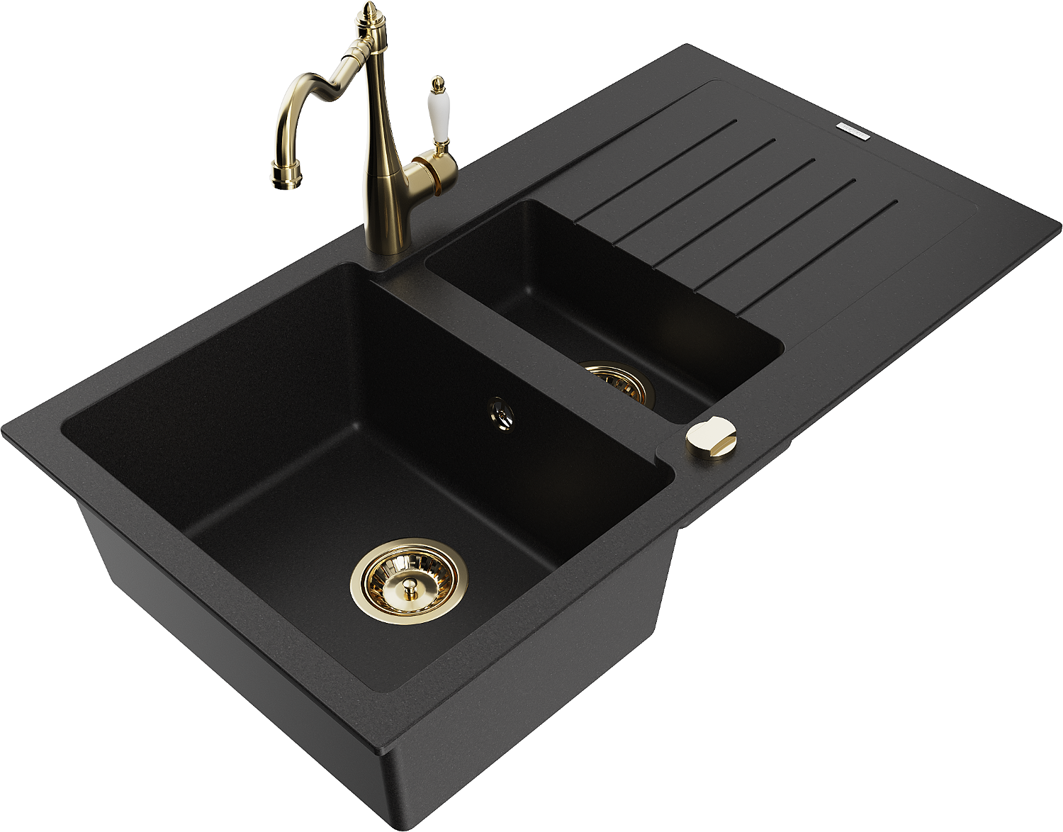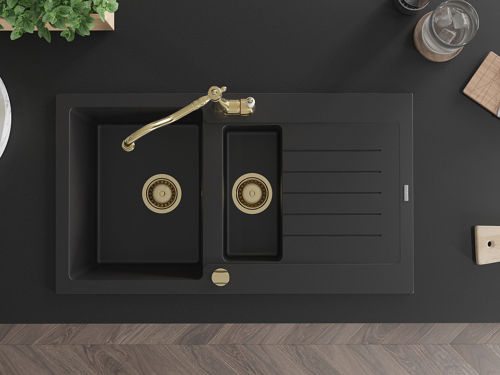 Mexen Matias lavello in granito 1,5 vasche con scolapiatti e rubinetto da cucina Carla, nero - 6502-77-670700-50