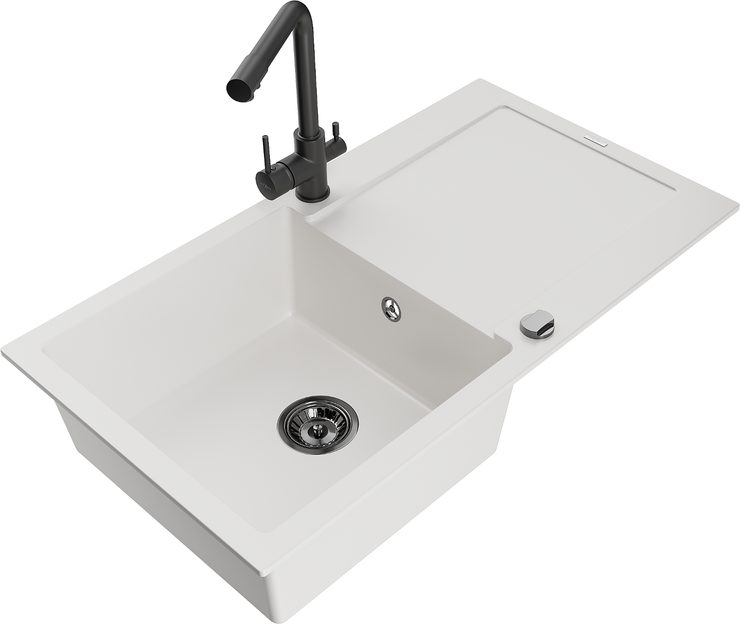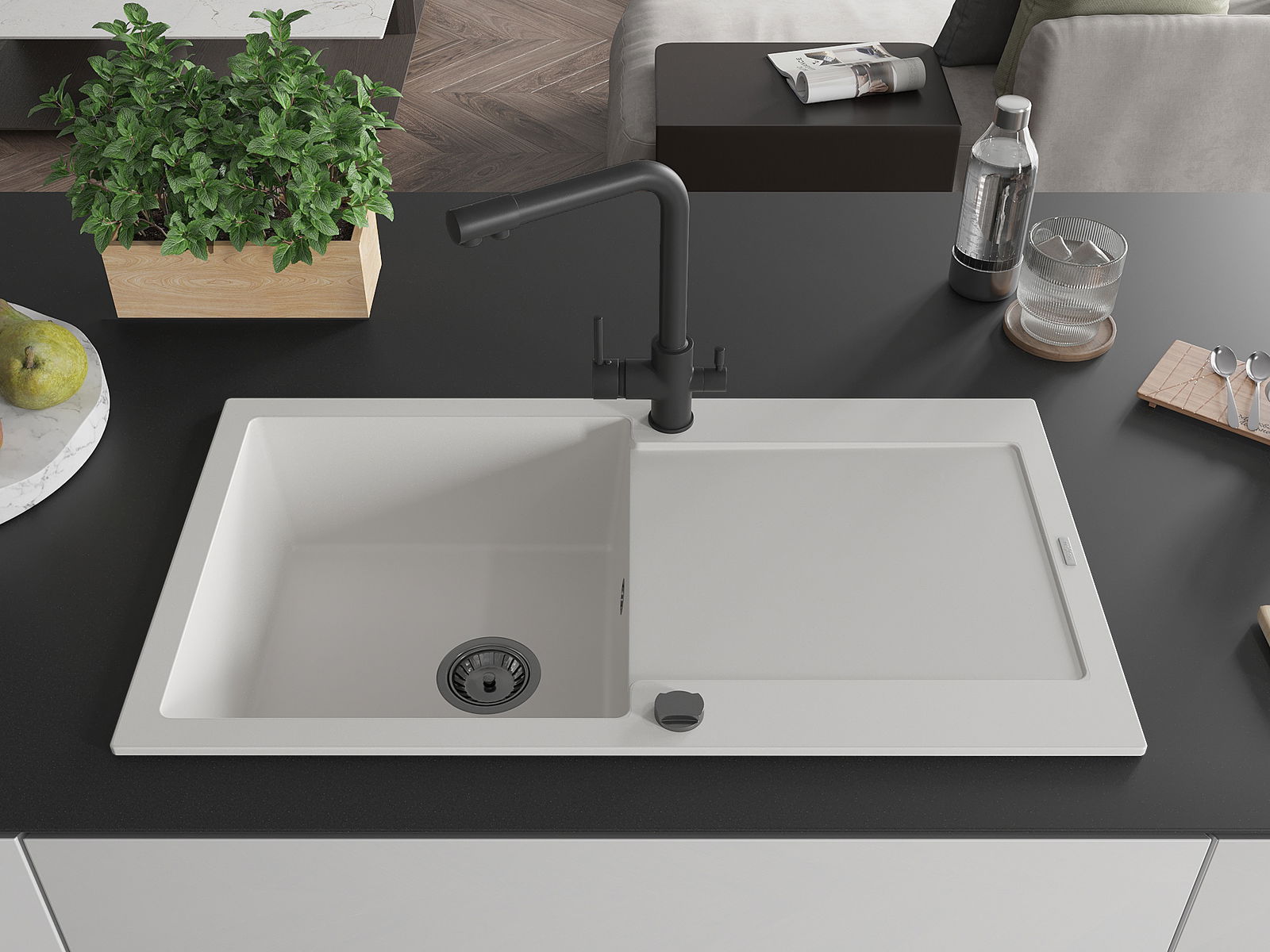 Mexen Leo lavello da cucina in granito 1 vasca con gocciolatoio e rubinetto da cucina Duero, bianco - 6501-20-671600-70