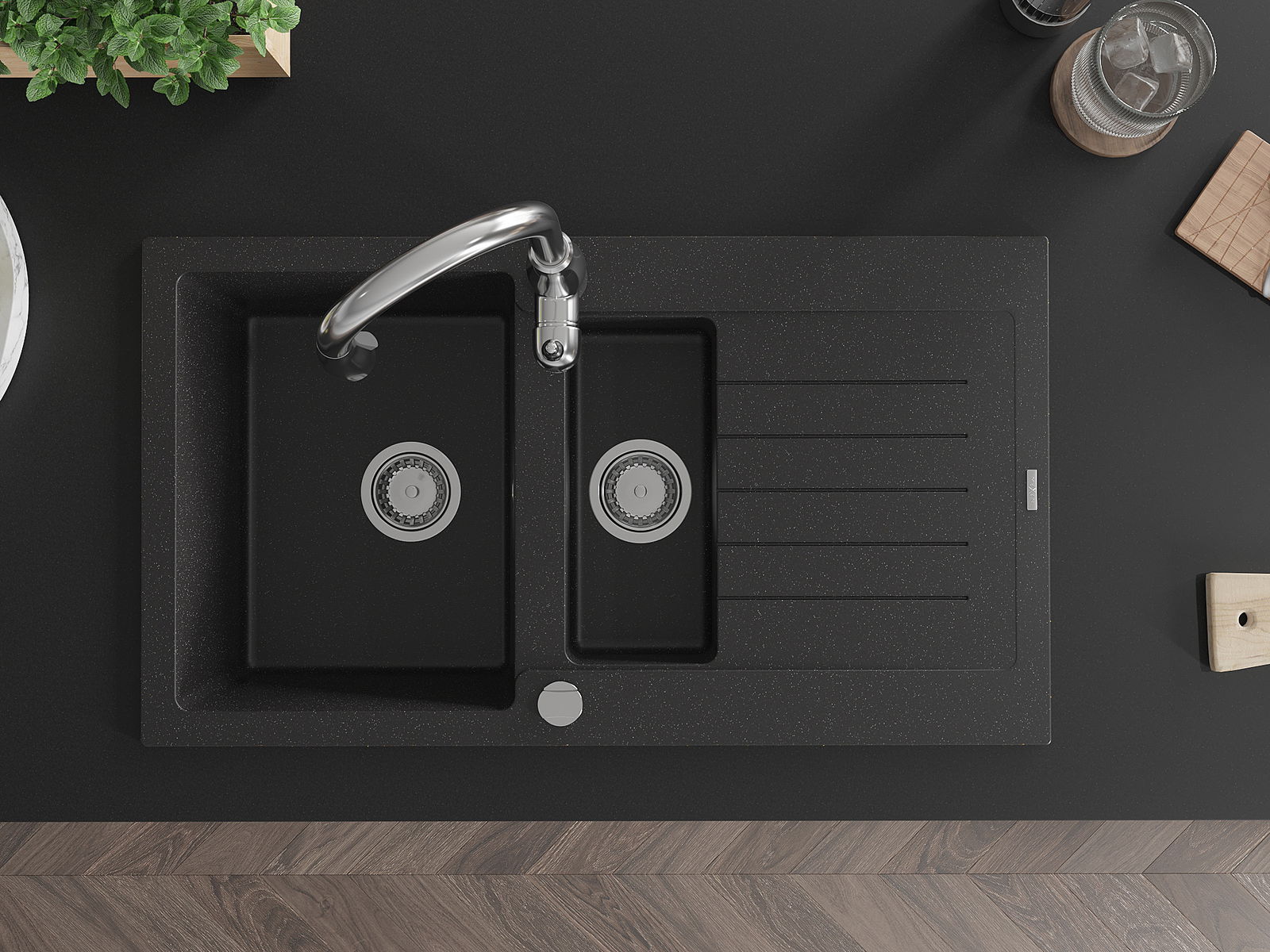 Mexen Matias lavello in granito 1,5 vasca con scolapiatti e rubinetto cucina Savita, nero/argento - 6502-73-672601-00