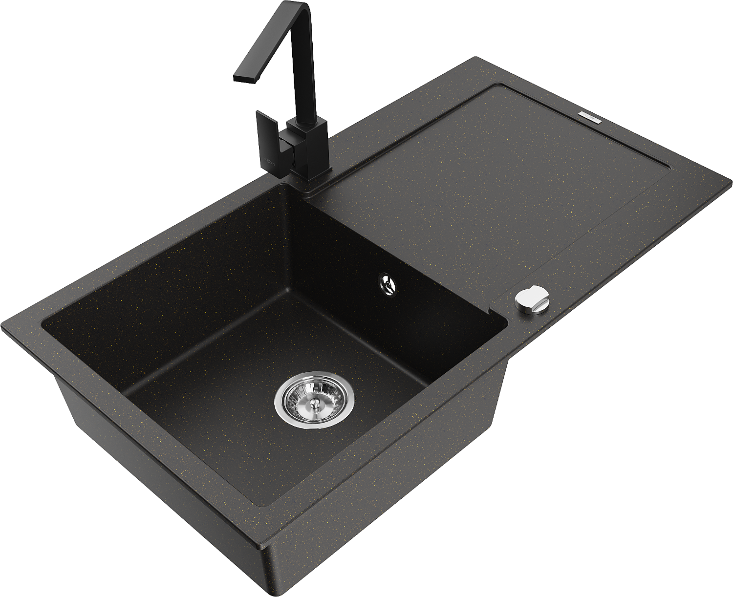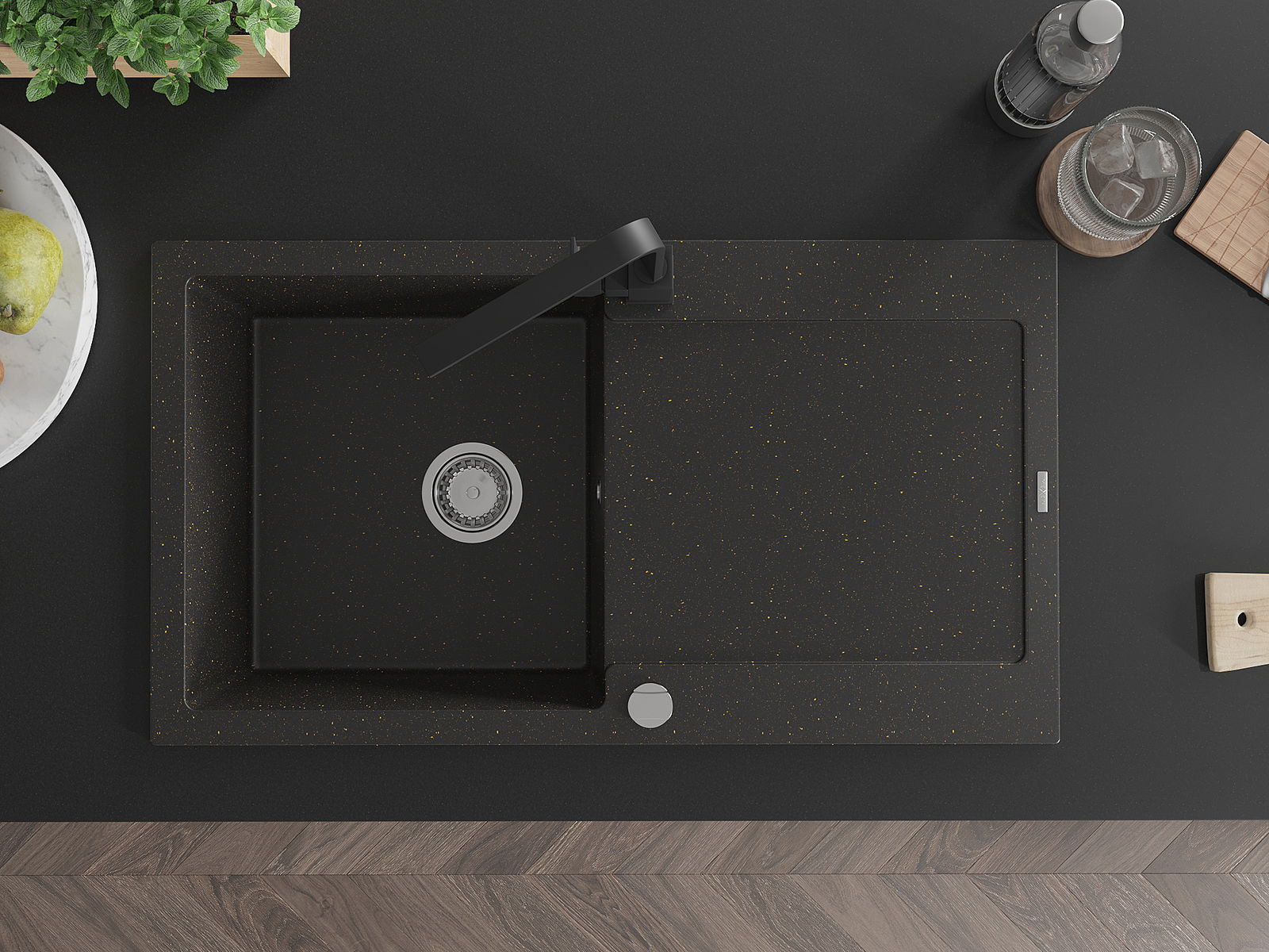 Mexen Leo lavello in granito a 1 vasca con gocciolatoio e rubinetto da cucina Rita, nero/oro metallizzato - 6501-75-670300-70