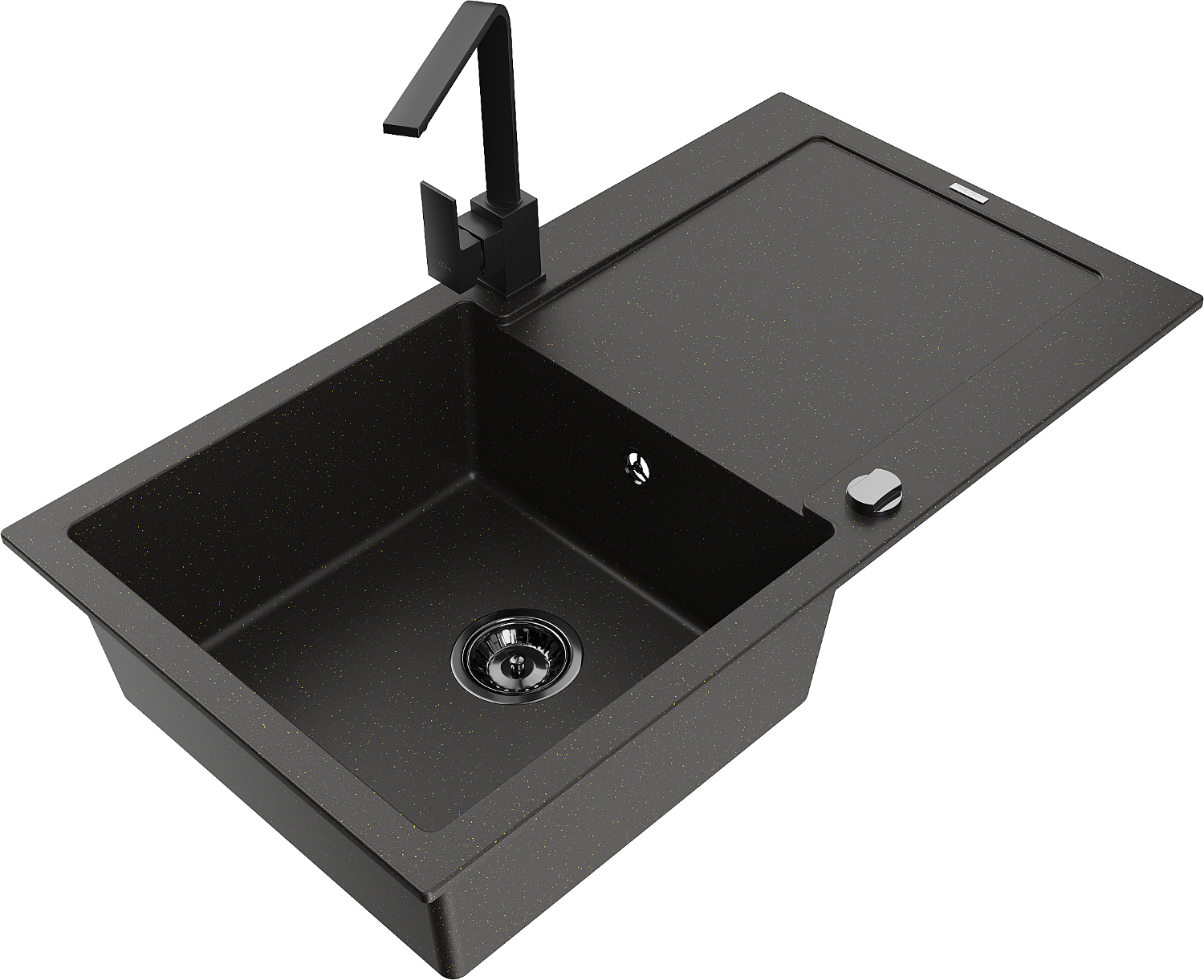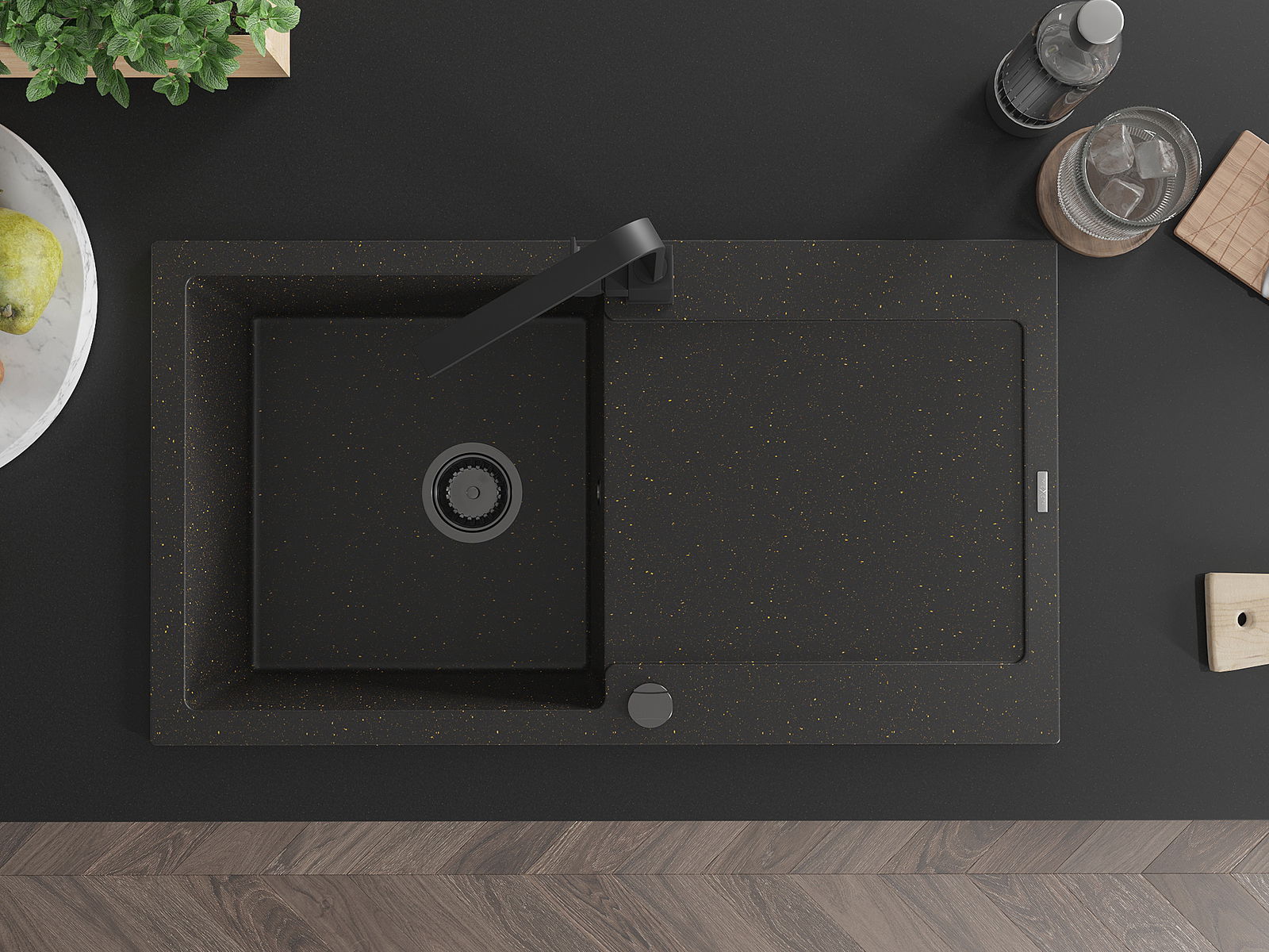 Mexen Leo lavello in granito a 1 vasca con scolapiatti e miscelatore cucina Rita, nero/oro metallizzato - 6501-75-670300-70-B