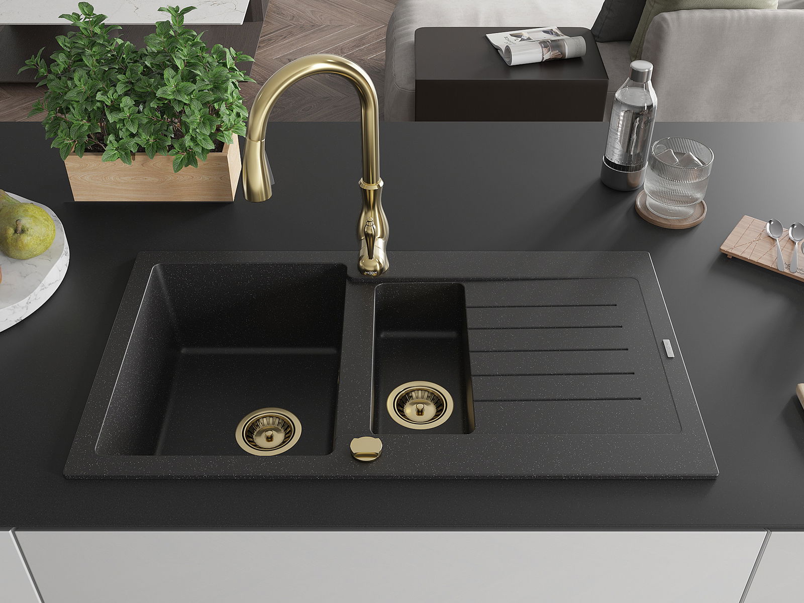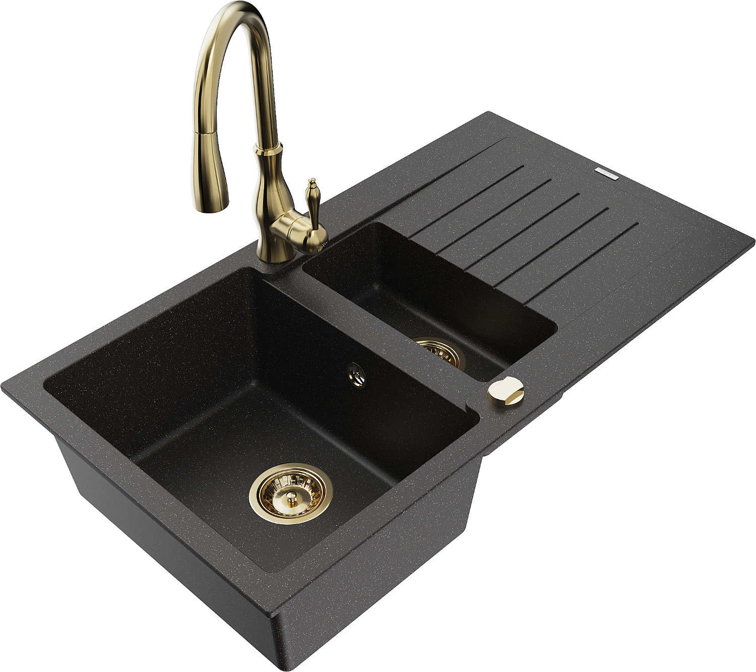 Mexen Matias lavello in granito 1,5 vasche con sgocciolatoio e rubinetto da cucina Savita, nero/argento - 6502-73-672601-50