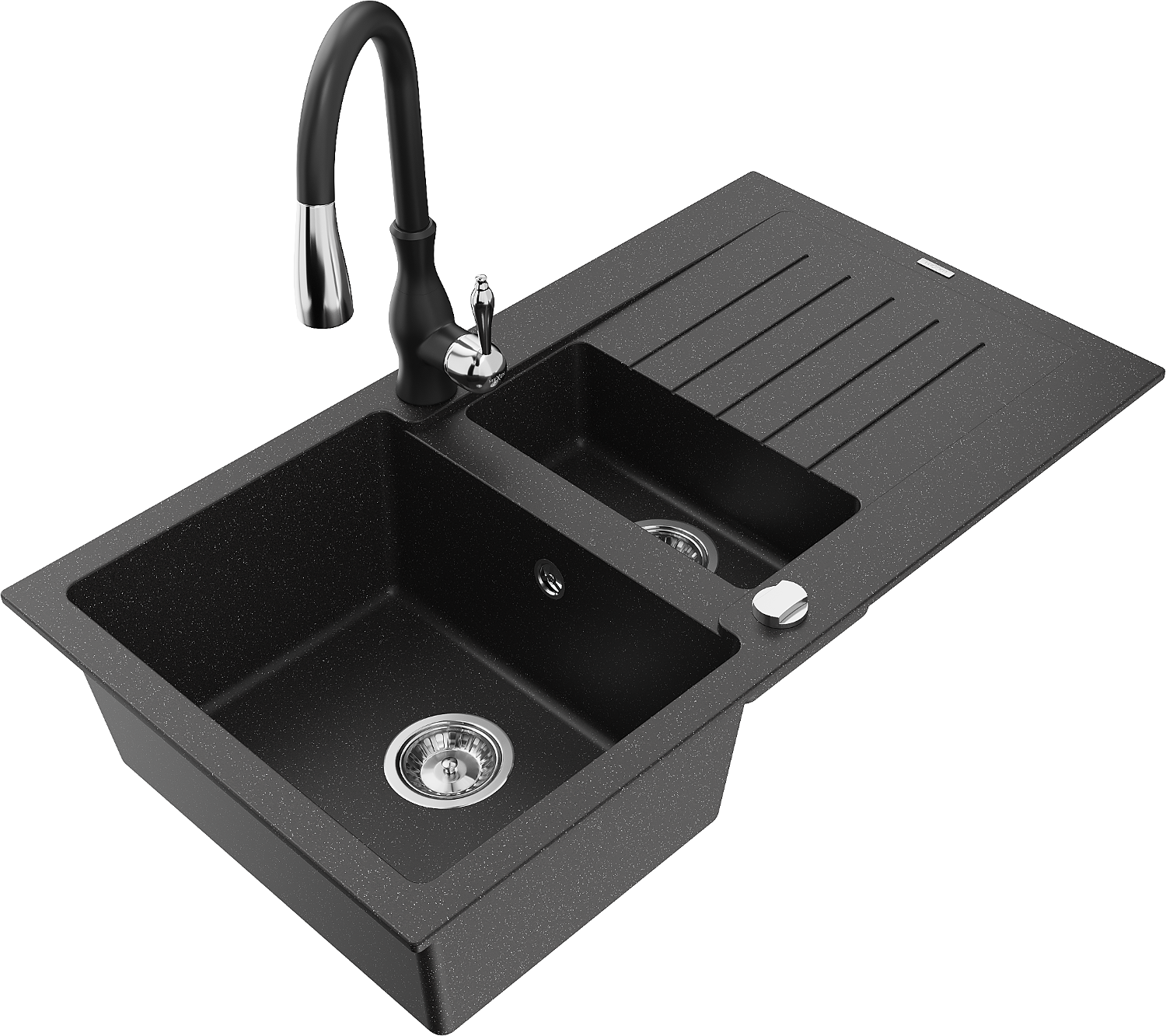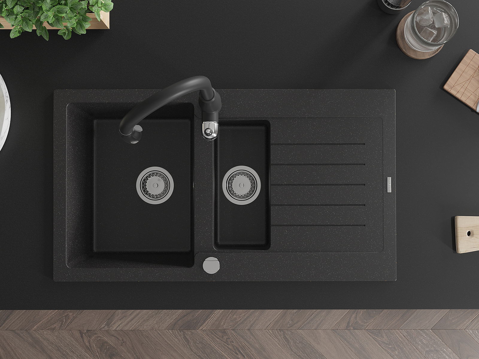 Mexen Matias lavello in granito a 1,5 vasche con sgocciolatoio e rubinetto da cucina Savita, nero/argento - 6502-73-672601-70
