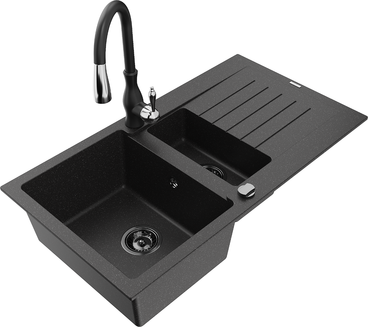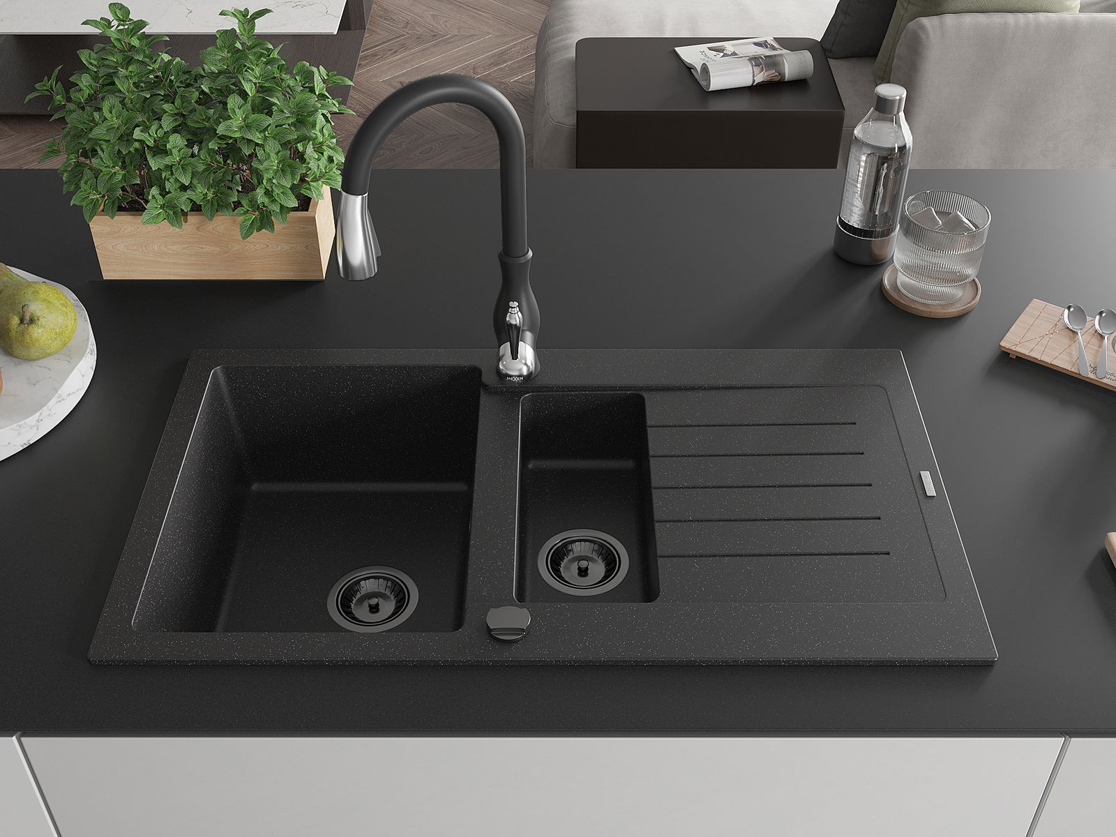 Mexen Matias lavello in granito 1,5 vaschetta con scolapiatti e rubinetto da cucina Savita, nero/argento - 6502-73-672601-70-B