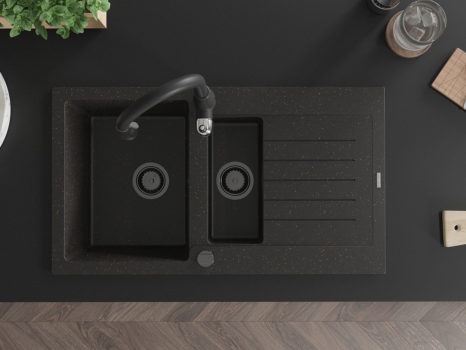 Mexen Matias lavello in granito a 1,5 vasche con scolapiatti e rubinetto da cucina Savita, nero/oro - 6502-75-672601-70-B