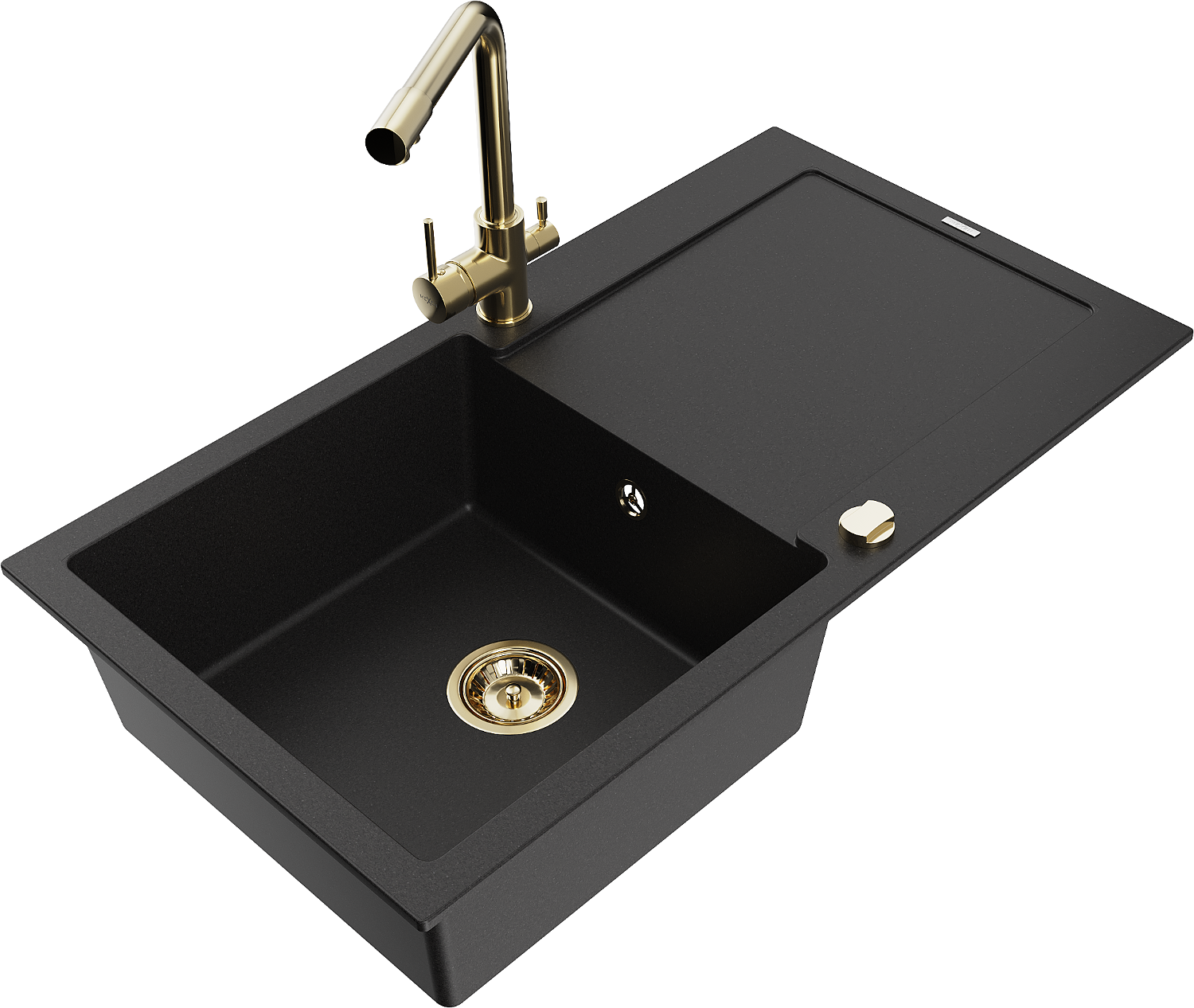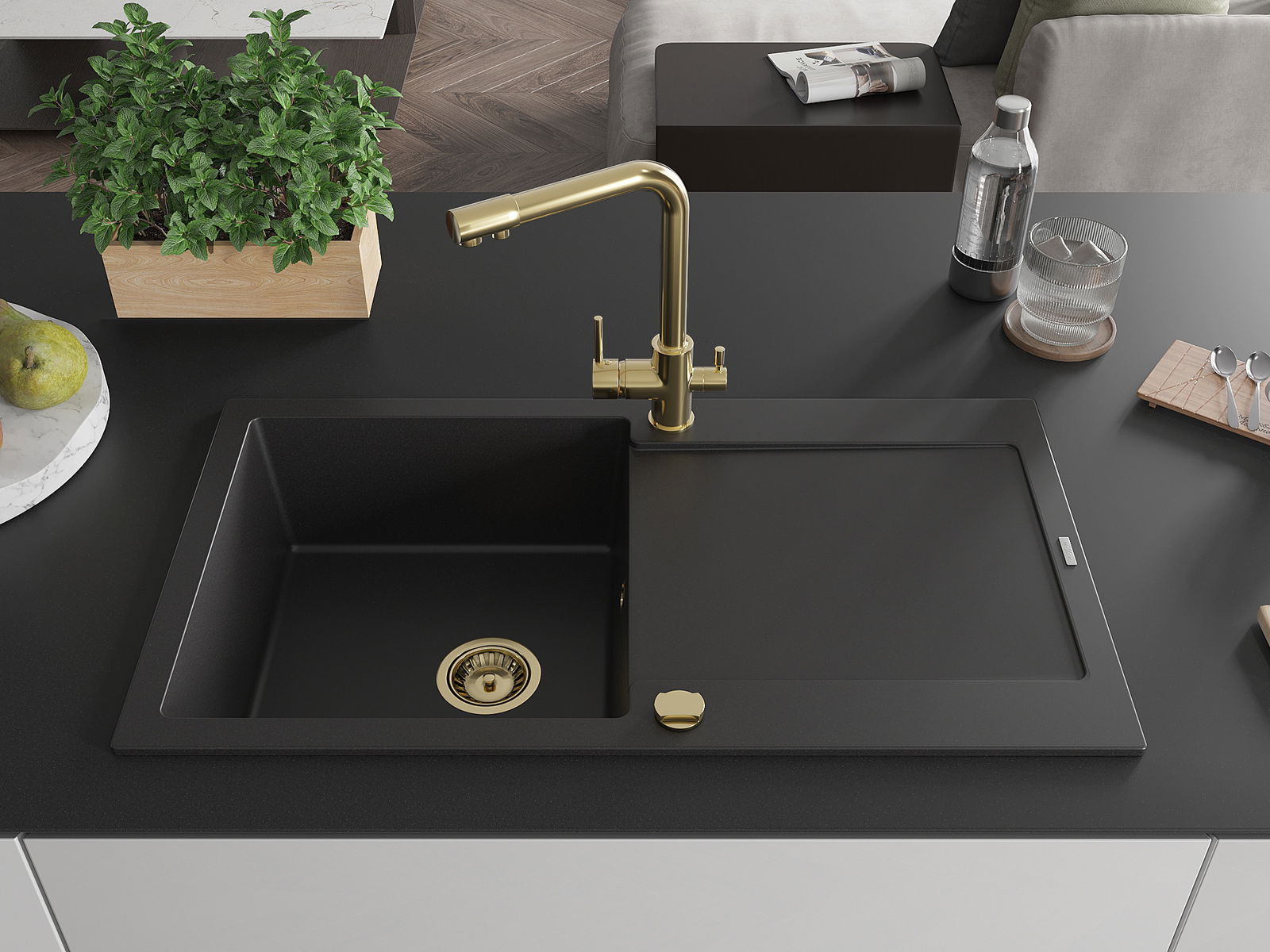 Mexen Leo lavello in granito a 1 vasca con scolapiatti e rubinetto da cucina Duero, nero - 6501-77-671600-50