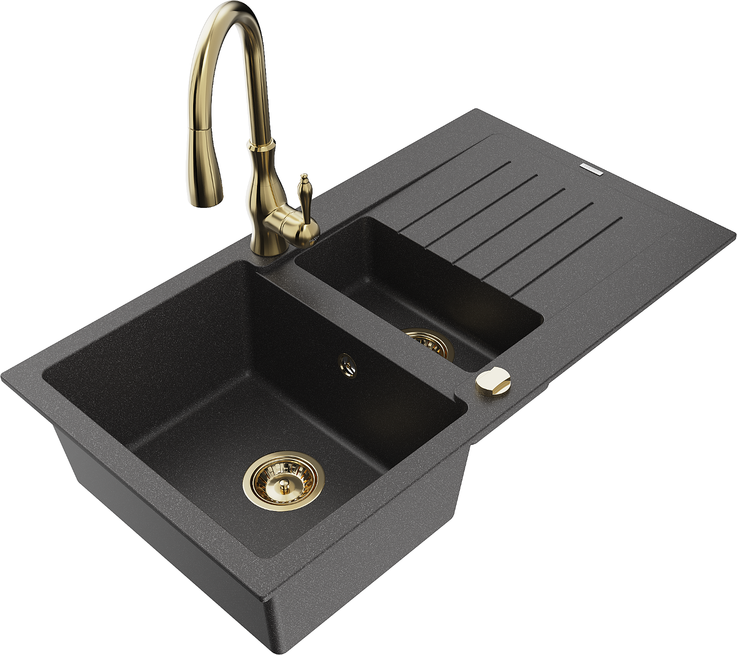 Mexen Matias lavello da cucina in granito 1,5 vasche con sgocciolatoio e rubinetto Savita, nero maculato - 6502-76-672601-50