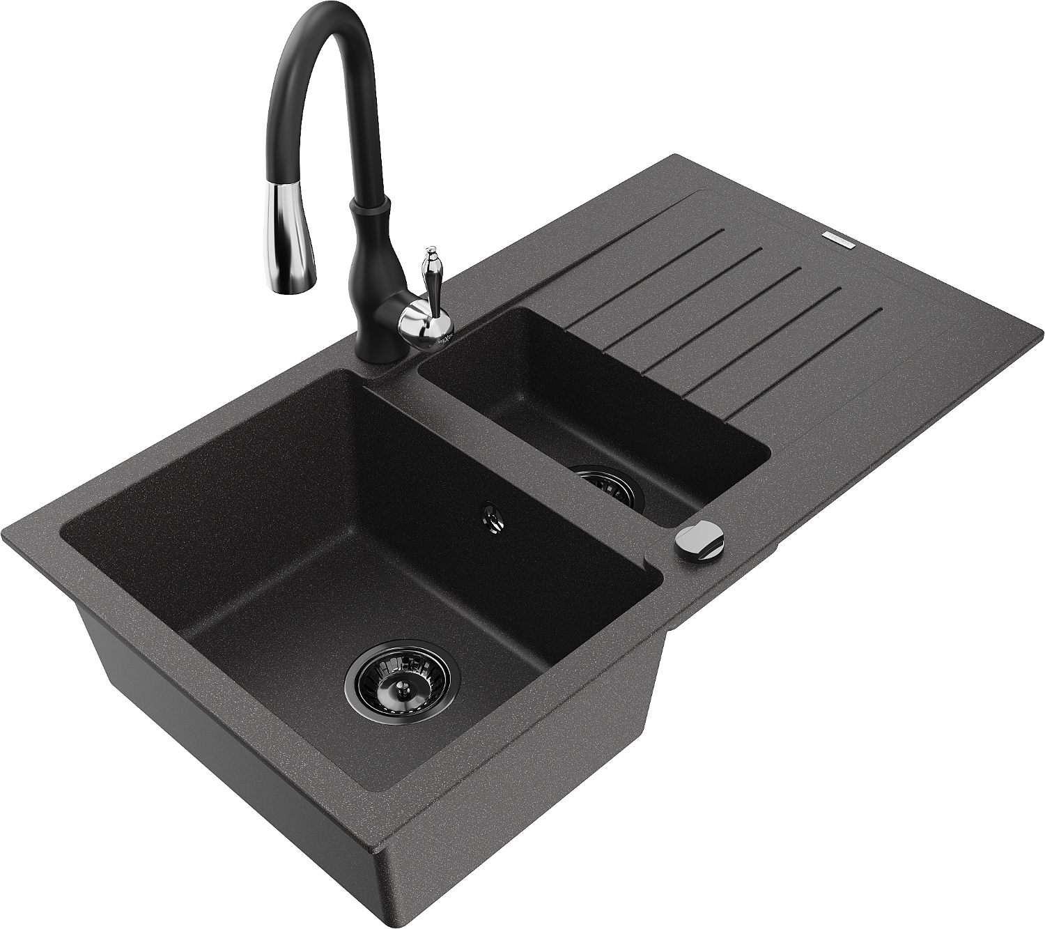 Mexen Matias lavello in granito 1,5 vasche con scolapiatti e rubinetto cucina Savita, nero maculato - 6502-76-672601-70-B