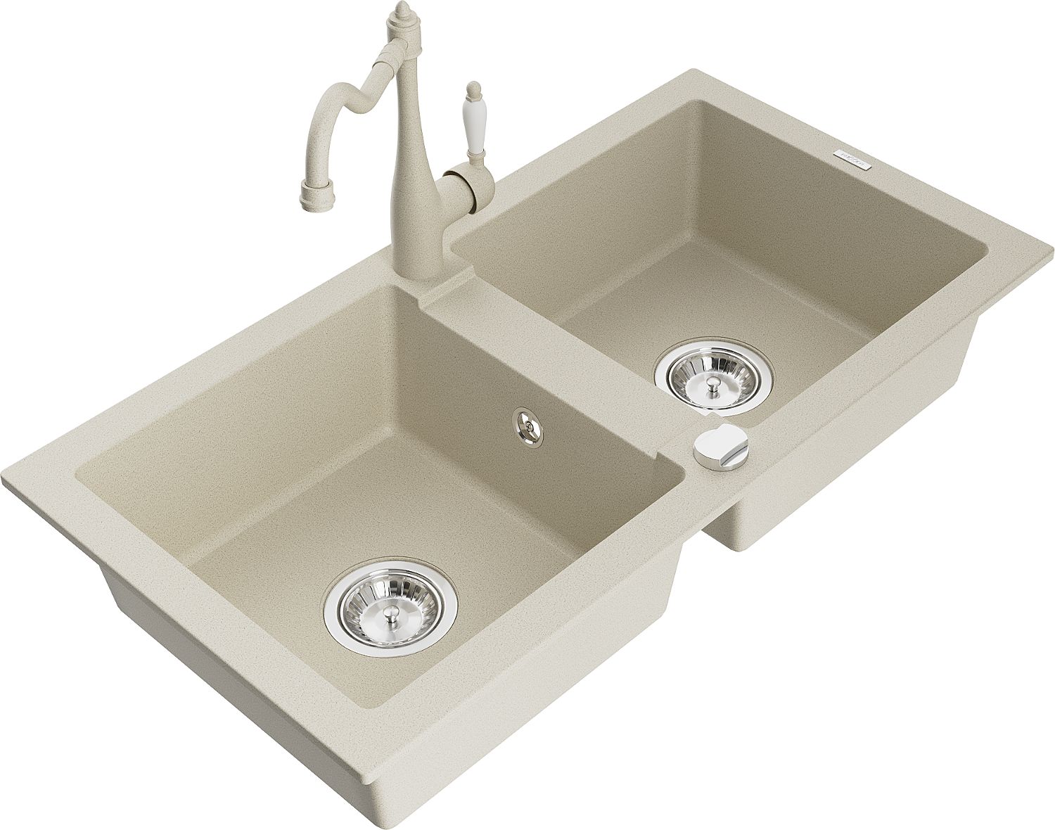 Mexen Mario lavello in granito a 2 vasche con miscelatore da cucina Carla, beige - 6504-69-670700-69