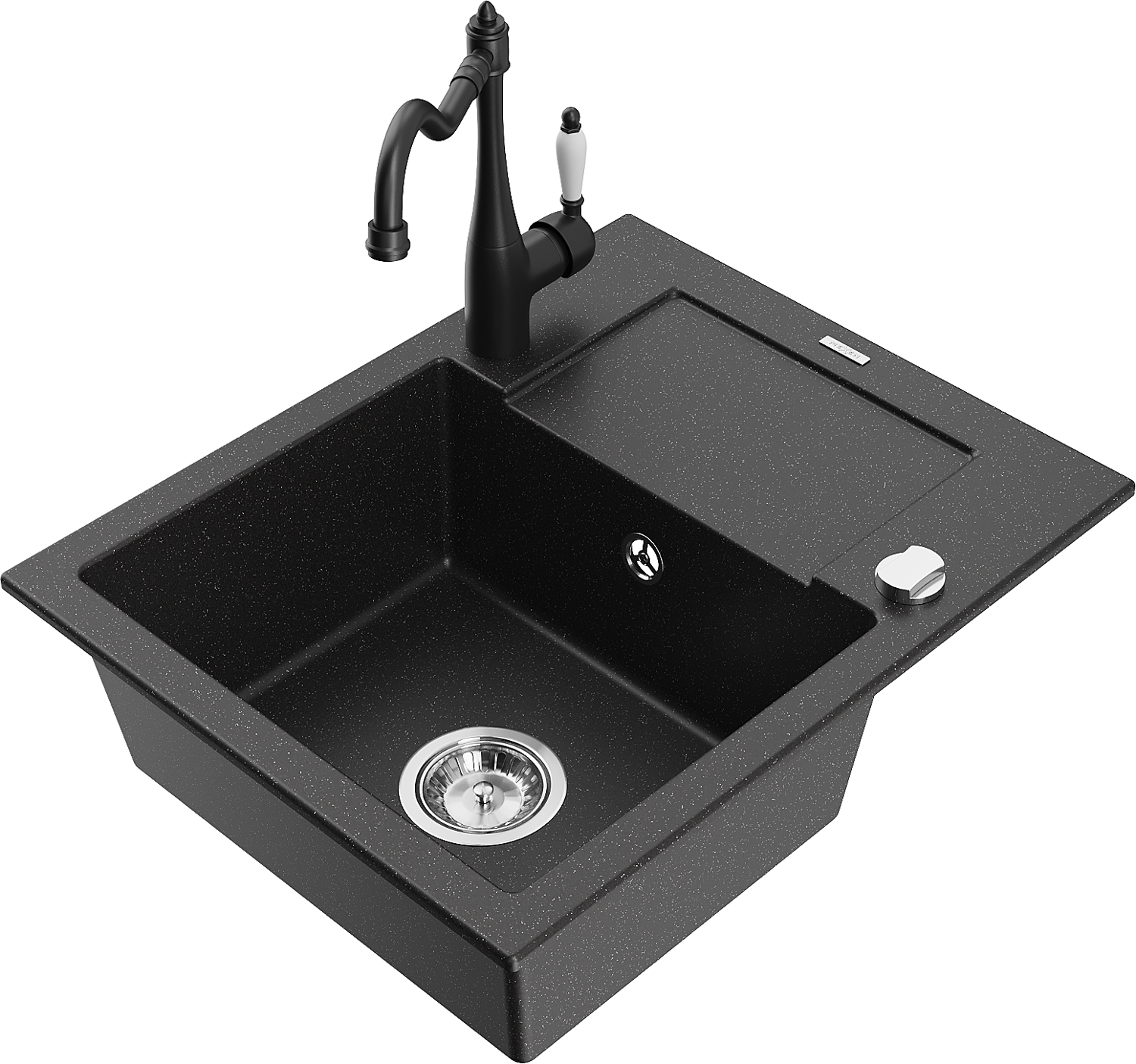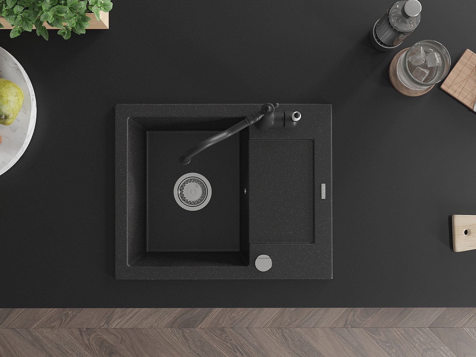 Mexen Enzo lavello in granito a 1 vasca con sgocciolatoio e rubinetto da cucina Carla, nero/argento metallico