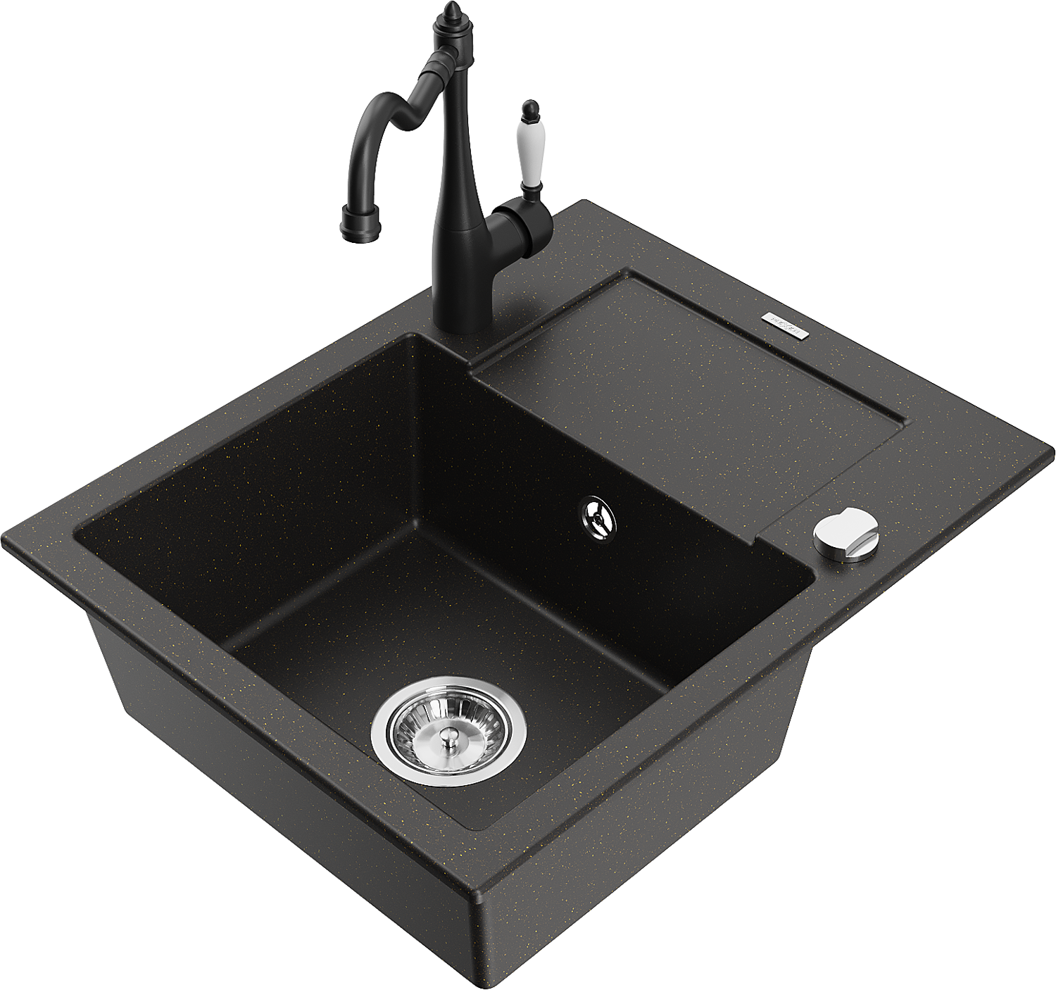 Mexen Enzo lavello in granito 1-vasca con scolapiatti e miscelatore cucina Carla, nero/oro metallizzato - 6506-75-670700-70