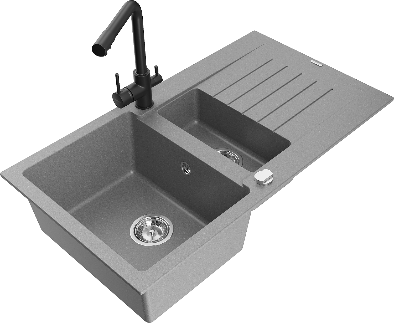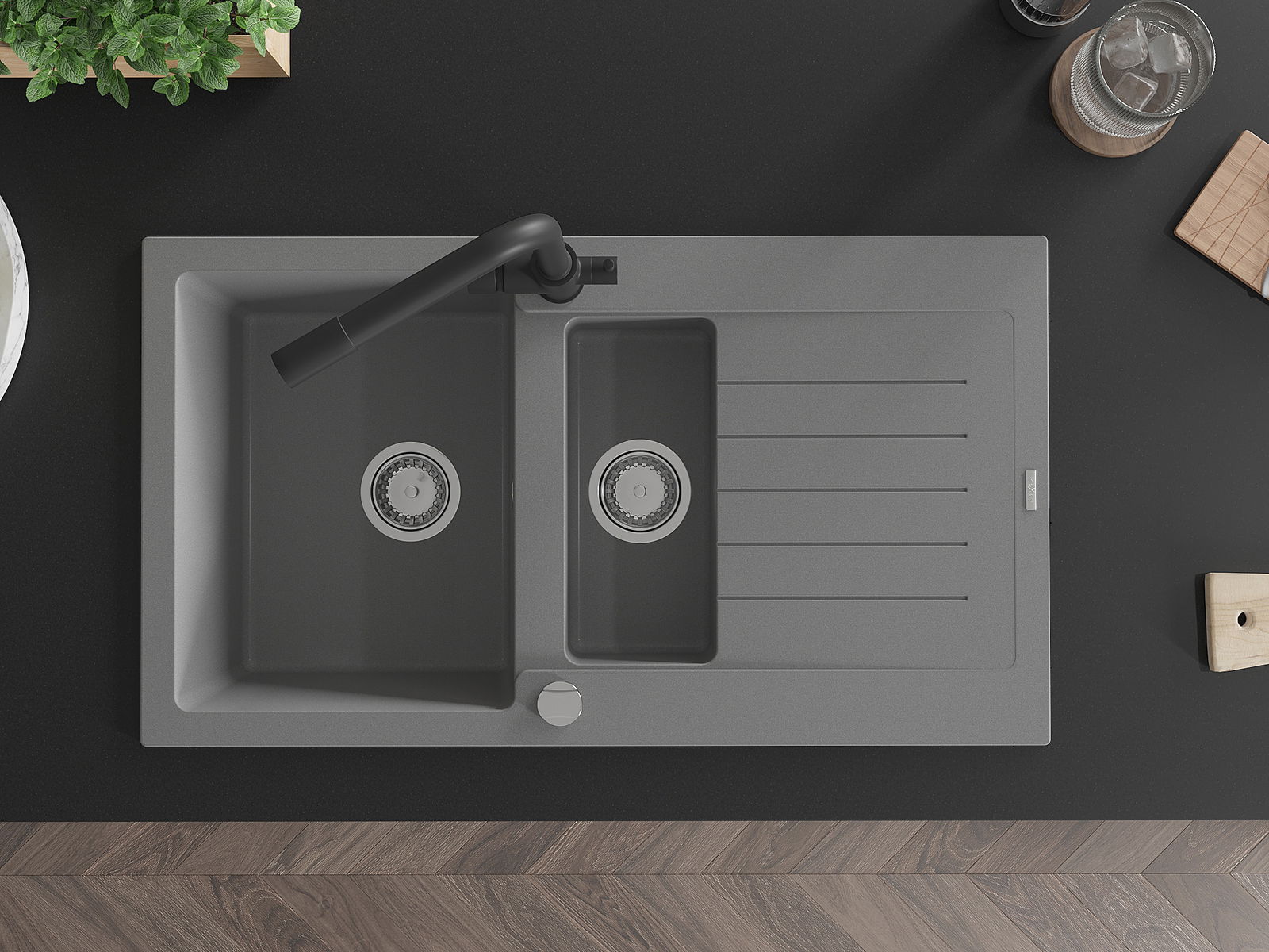 Mexen Matias lavello in granito 1,5 vasca con sgocciolatoio e rubinetto da cucina Duero, grigio - 6502-71-671600-70