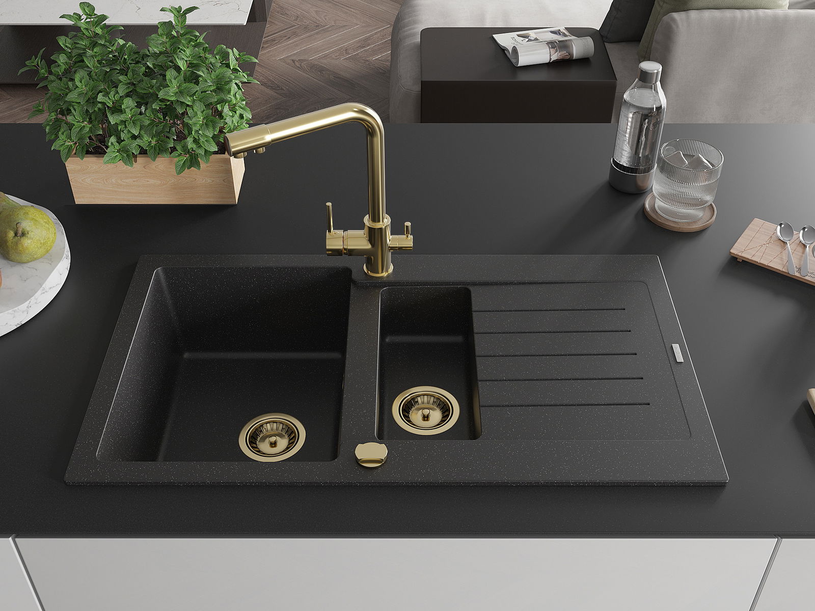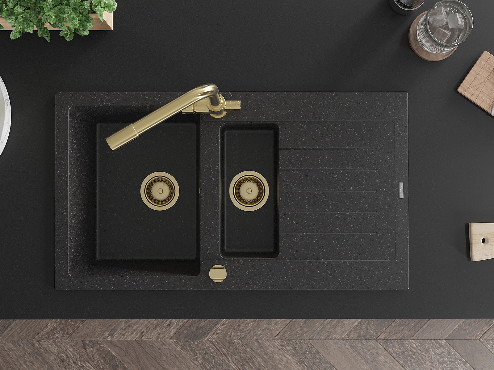Mexen Matias lavello in granito 1,5 vasche con scolapiatti e miscelatore cucina Duero, nero/metallo argento- 6502-73-671600-50