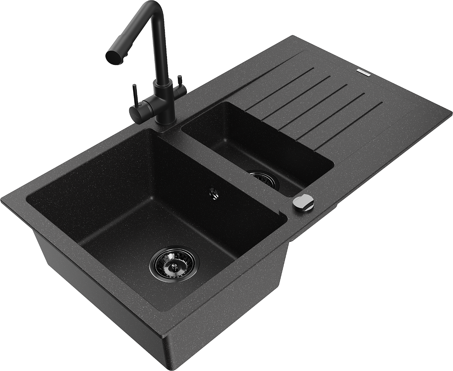 Mexen Matias lavello in granito 1,5 vasche con sgocciolatoio e rubinetto da cucina Duero, nero/argento - 6502-73-671600-70-B