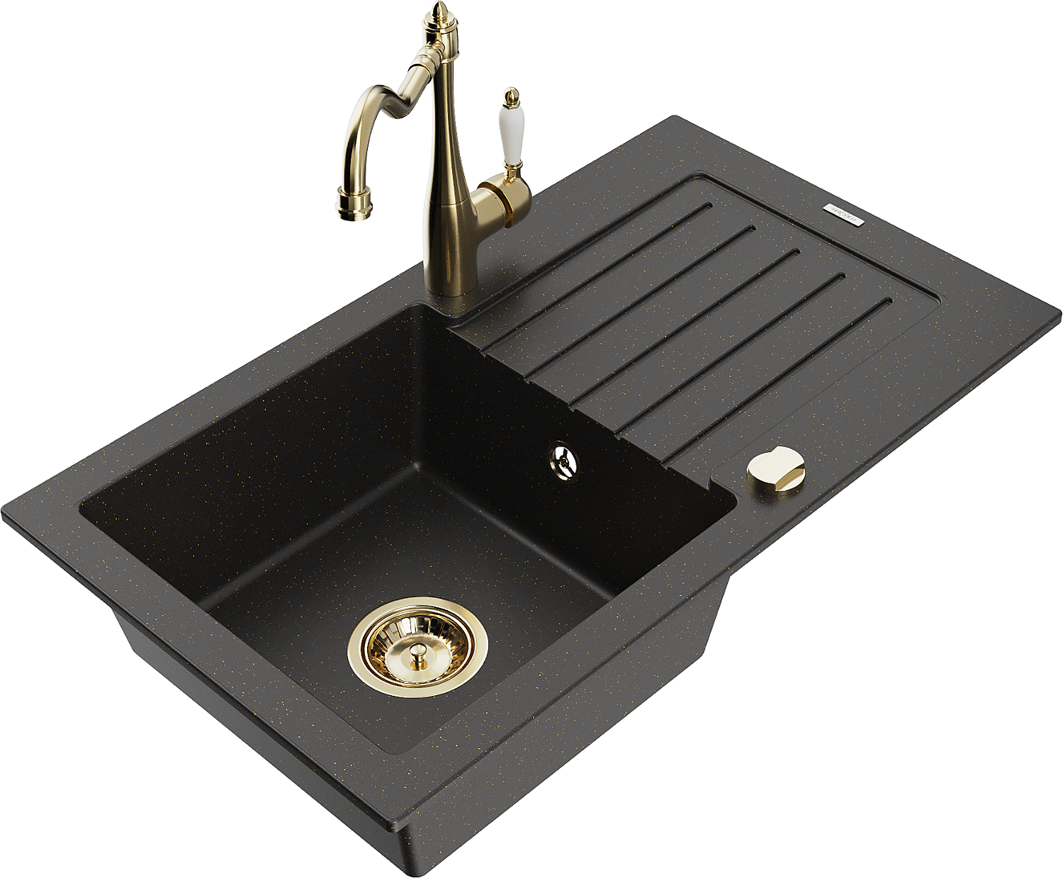 Mexen Pablo lavello in granito 1-vasca con scolapiatti e miscelatore da cucina Carla, nero/oro metallico - 6510-75-670700-50