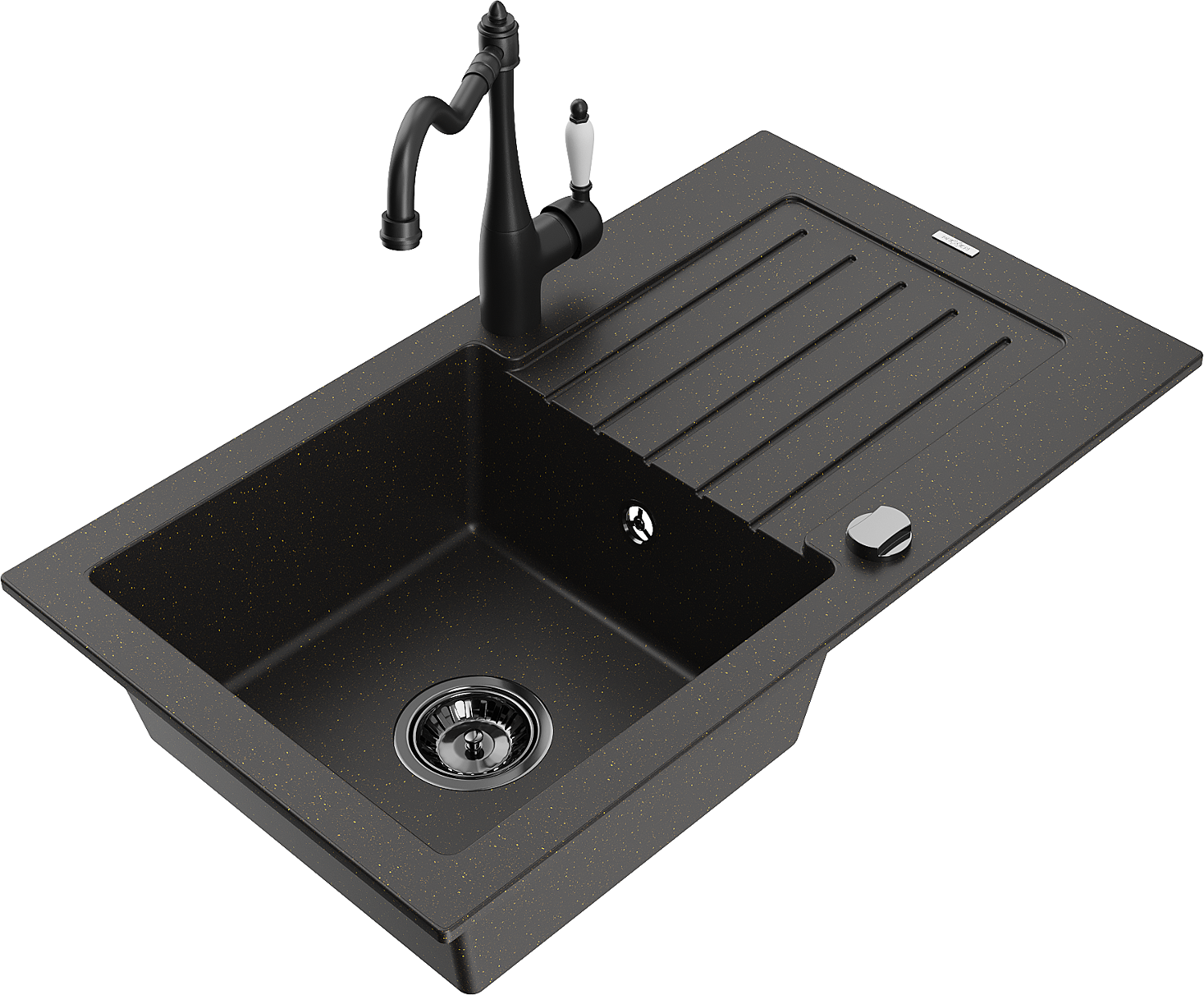 Mexen Pablo lavello in granito a 1 vasca con scolapiatti e rubinetto da cucina Carla, nero/oro metallizzato