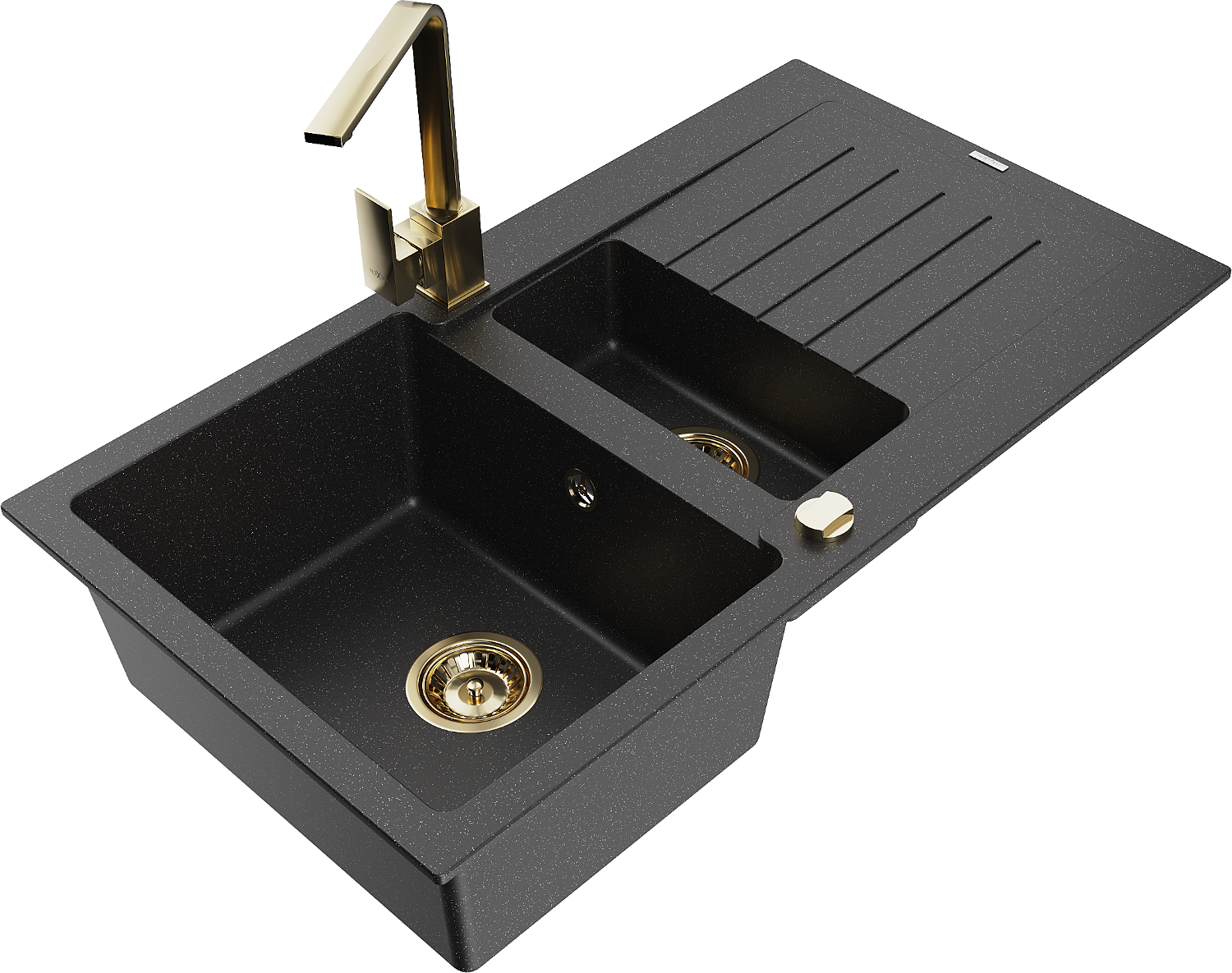 Mexen Matias lavello in granito 1,5 vasche con scolapiatti e rubinetto da cucina Rita, nero/metallo argento - 6502-73-670300-50