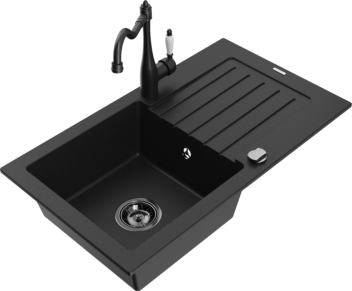 Mexen Pablo lavello in granito 1-vasca con sgocciolatoio e rubinetto da cucina Carla, nero - 6510-77-670700-70-B