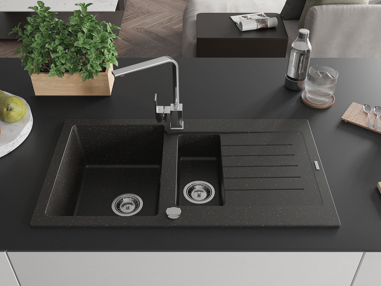La scelta di un lavello con sgocciolatoio è una soluzione pratica che consente di riporre piatti, verdure e frutta lavati. Lo sgocciolatoio facilita la cucina quotidiana e aiuta a mantenere l'ordine in cucina.
