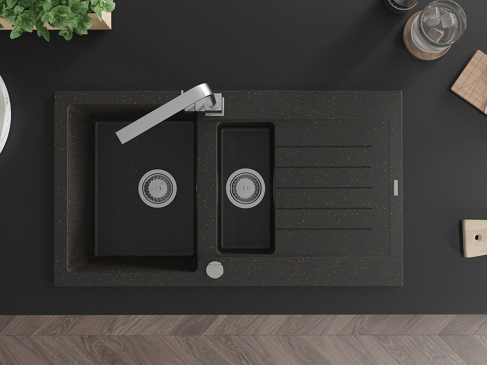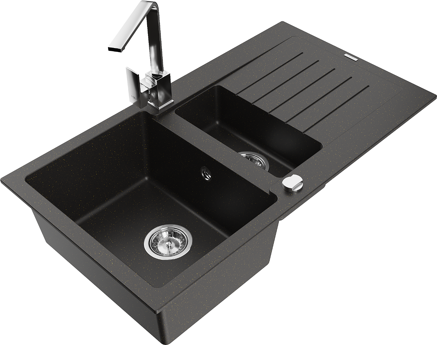 Mexen Matias lavello in granito 1,5 vasche con sgocciolatoio e rubinetto da cucina Rita, nero/oro - 6502-75-670300-00